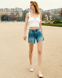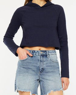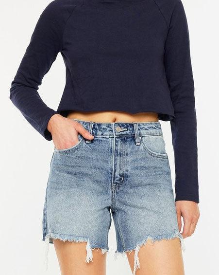 Classic denim shorts that feature a high rise, comfort stretch and a frayed hem. Done with a 5" inseam, these shorts give coverage without being too long or too short. A wardrobe staple!