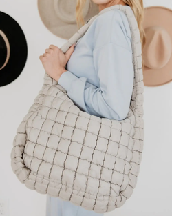 The ideal companion for any occasion, the Sand Oversized Quilted Hobo Tote Bag combines stylish quilted puff design with generous size. This elegant tote is sure to prompt compliments, inviting the question, "Where did you find that?"