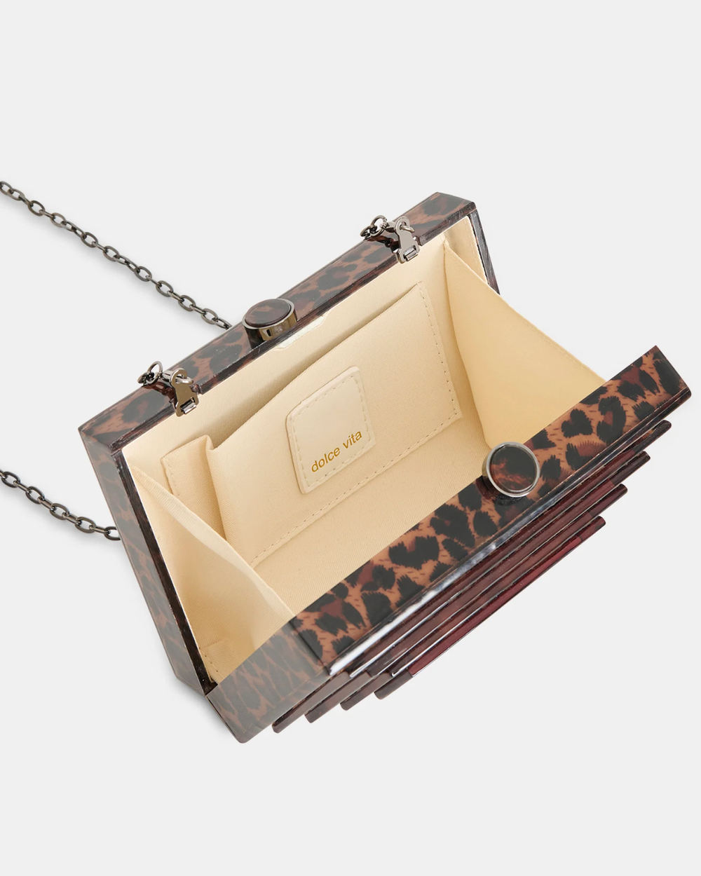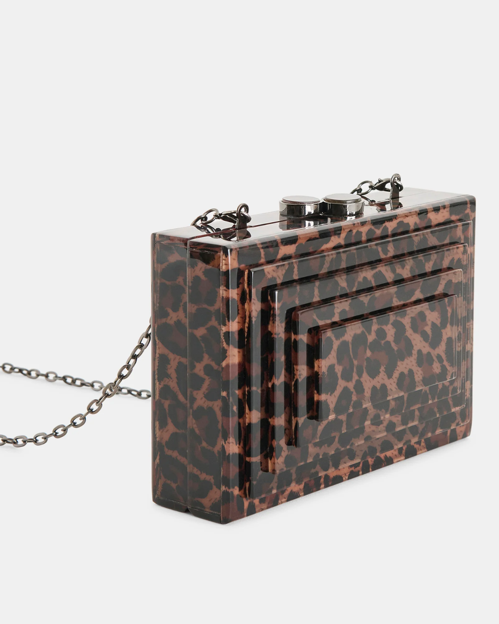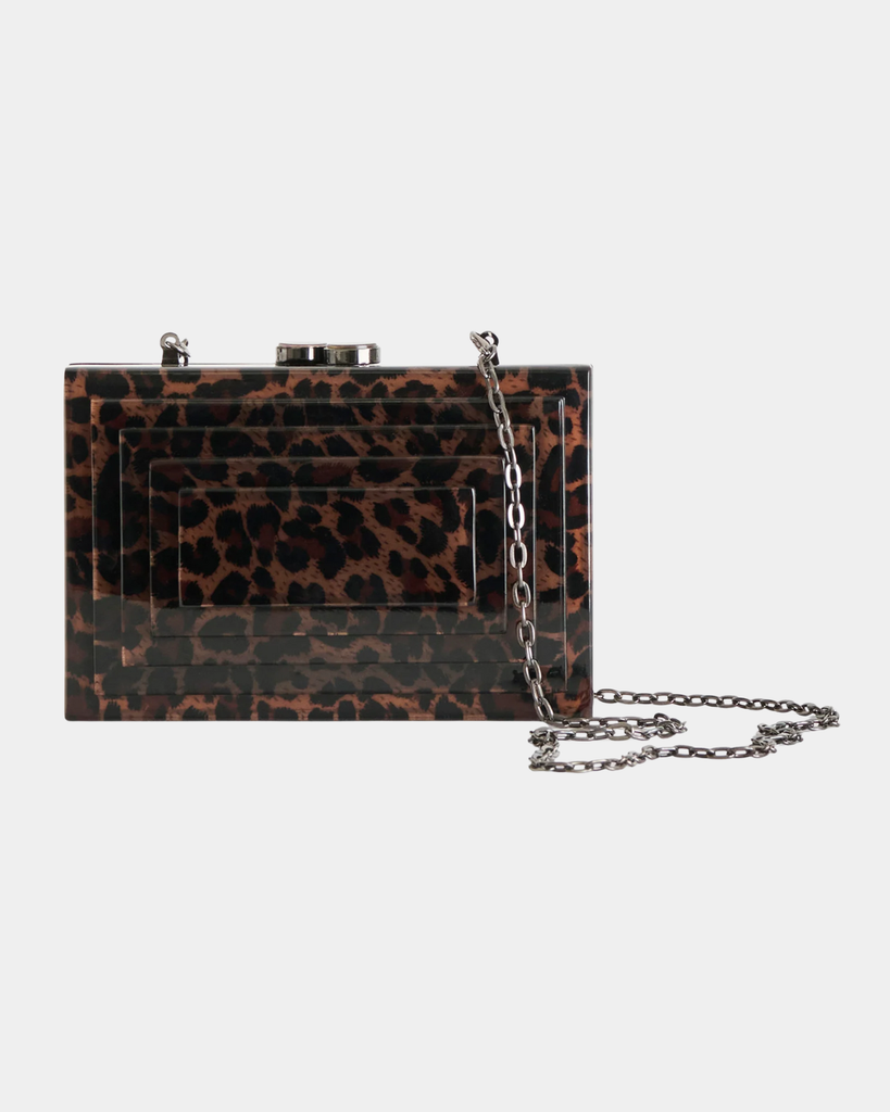 Elevate your evening with the Keesha Clutch, a refined acrylic design featuring a striking leopard-accented frame. Compact yet chic, this petite clutch secures your essentials in style, making it the perfect companion for any sophisticated occasion.