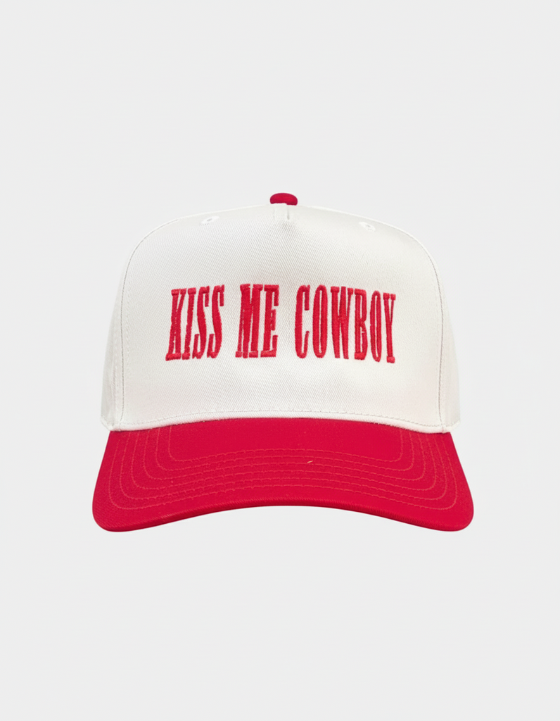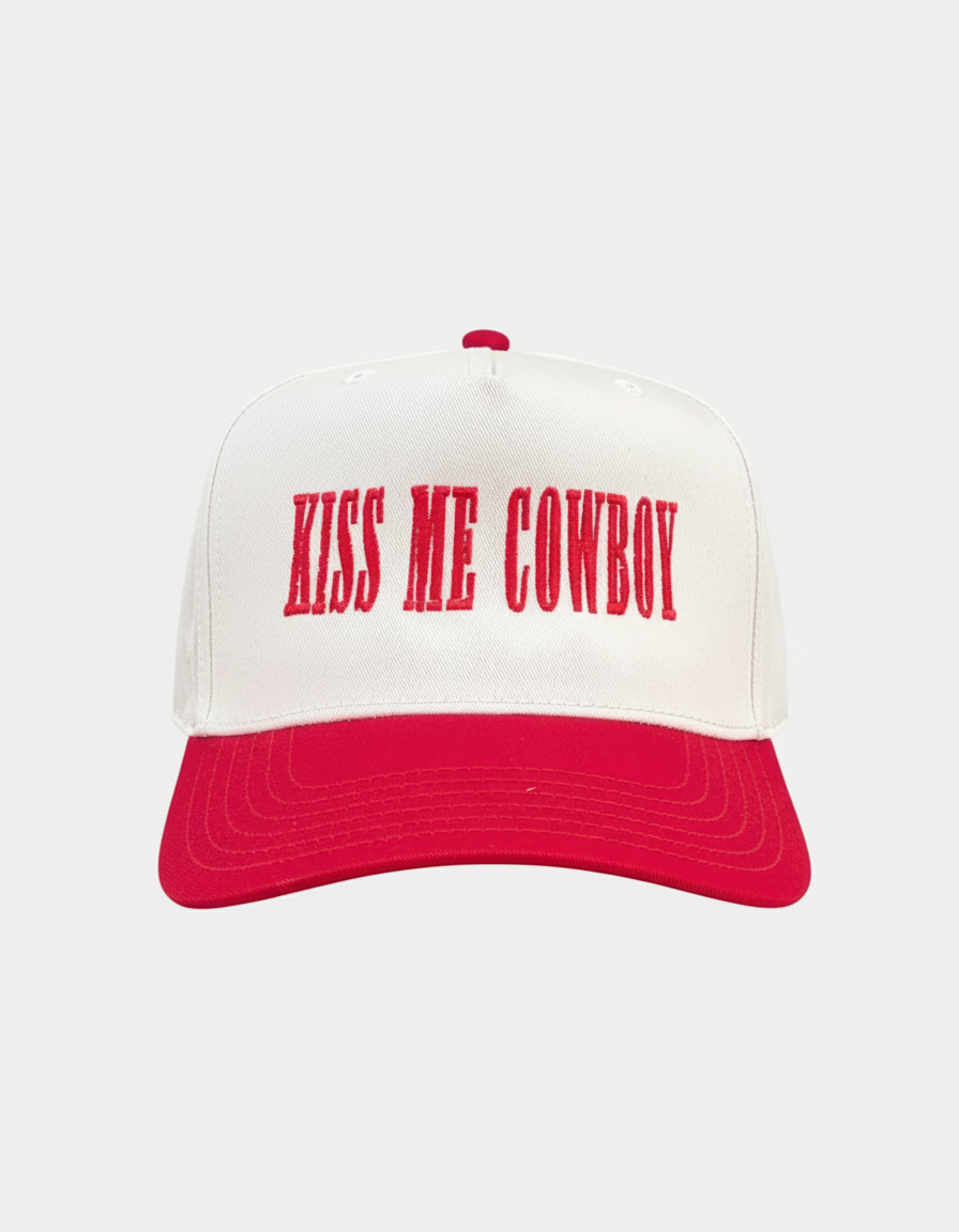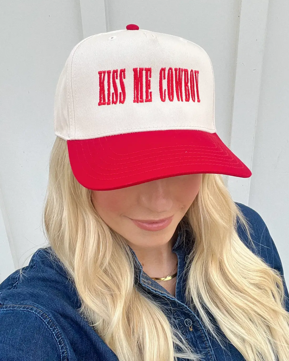 Add a splash of fun to your look with the Kiss Me Cowboy Embroidered Hat in vibrant red and natural tones. Perfect for turning heads and stealing hearts wherever you ride!