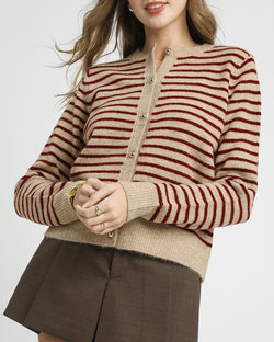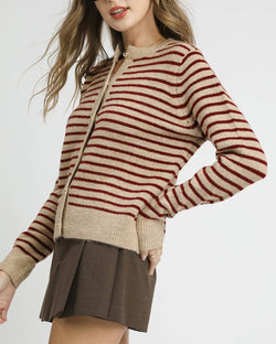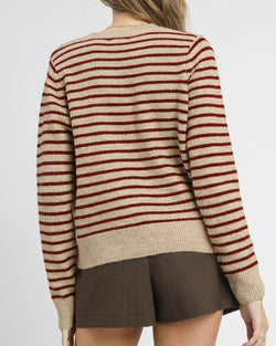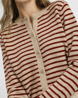 This knit cardigan features a button down front, a crew neckline and a classic stripe design. Easy to style and comfy to wear, this is a must for work or play.