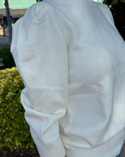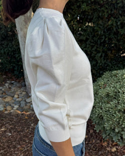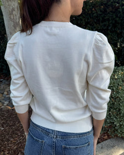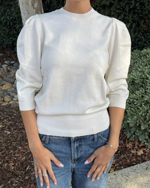 Cozy up your fall wardrobe with this playful off-white sweater top. Featuring a round neckline and charming puffed mid-length sleeves, it adds just the right touch of fun while keeping you comfortably warm. The creamy hue makes it a versatile staple you’ll reach for again and again.