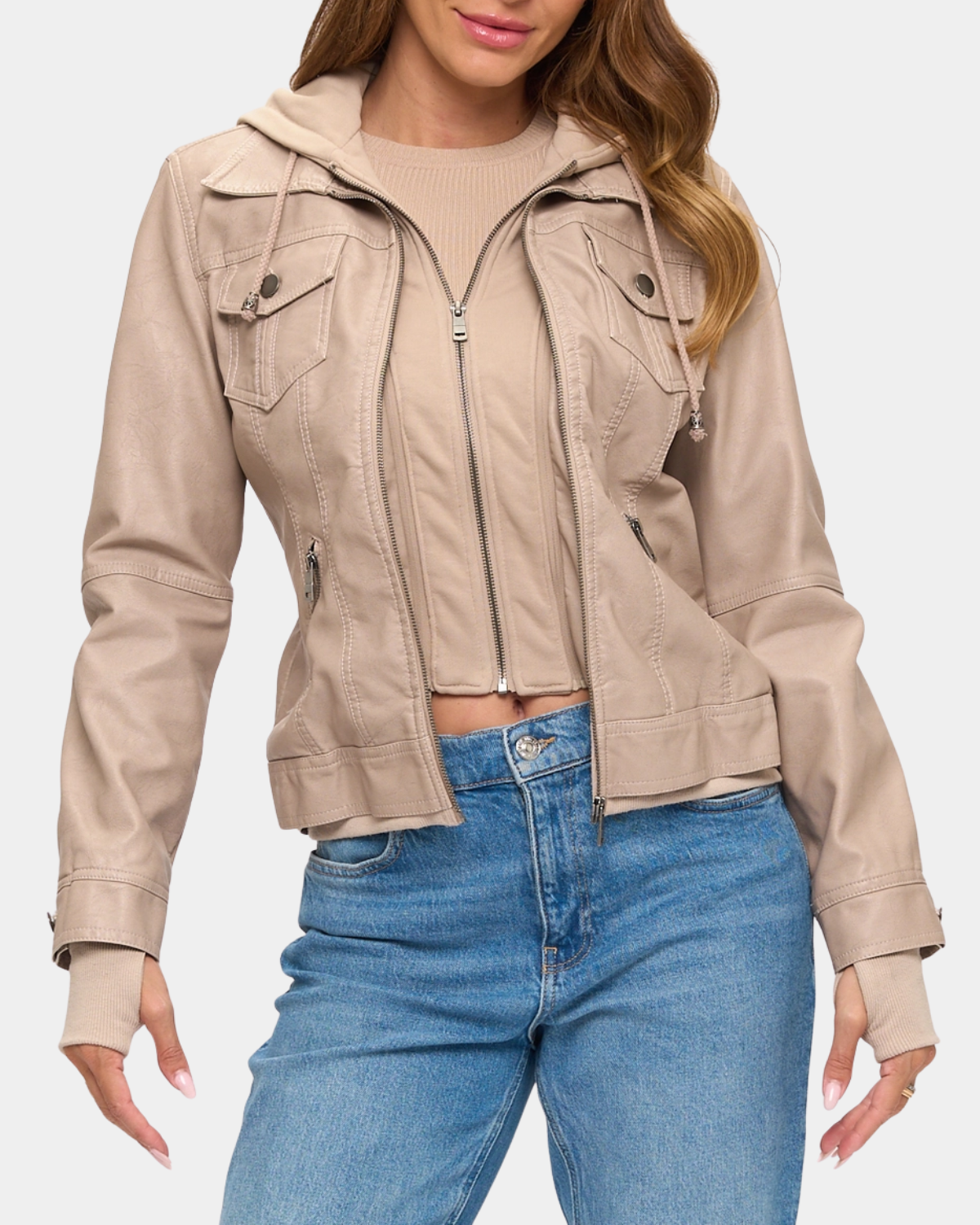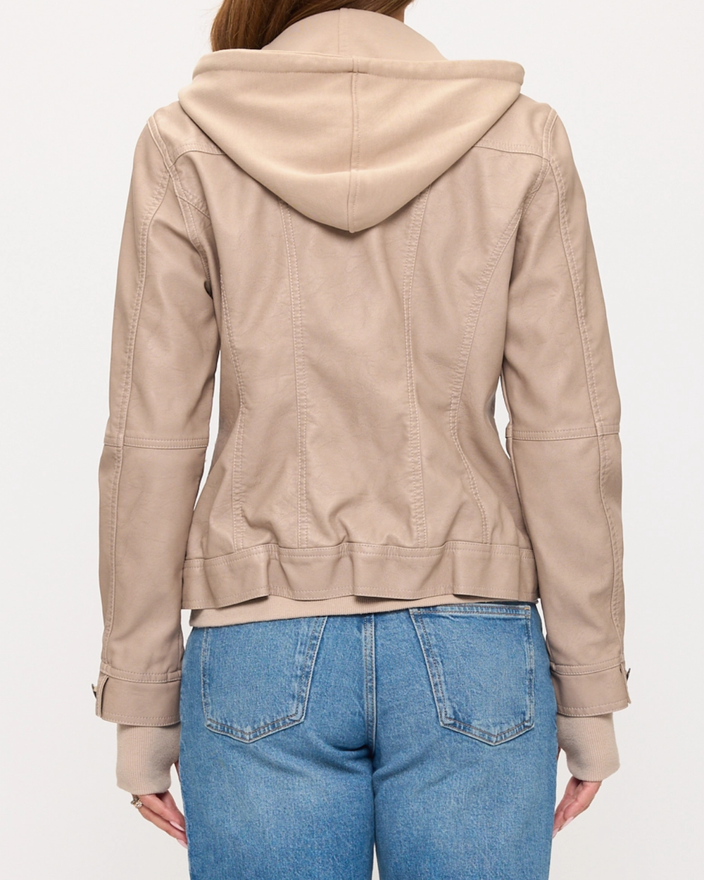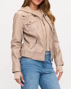 Slide into this cream vegan leather bomber jacket with a hood that's all about fun and flair. Lightweight and lively, it’s your new favorite way to brighten up chilly days with style.