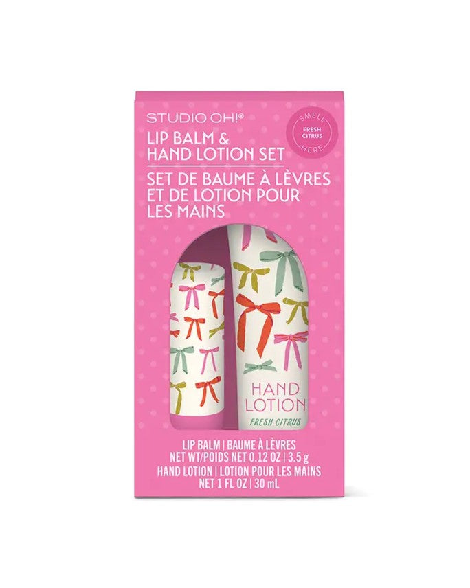 The Lip Balm & Hand Lotion Set from Studio Oh! includes a 1 oz hand cream and lip balm packaged in a clear, reusable pouch. The unscented lip balm helps gently moisturize and smooth dry lips, while the scented hand lotion hydrates hands and cuticles. The two-piece set is artfully designed and perfect for carrying in a handbag or gifting to a friend.