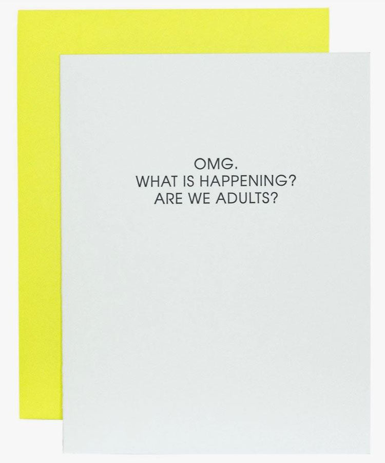 Our "OMG Are We Adults" birthday card is letterpress printed on a vintage printing press.