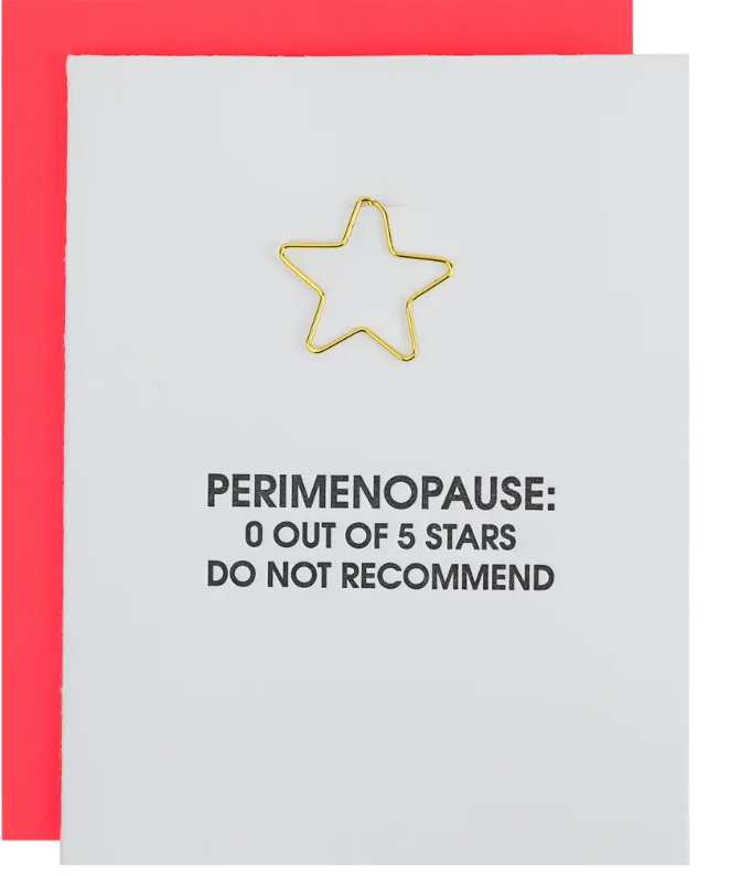 The "Perimenopause : 0/5 Stars" card is letterpress printed on a vintage printing press in sunny California. Card includes a heavy duty star paper clip.