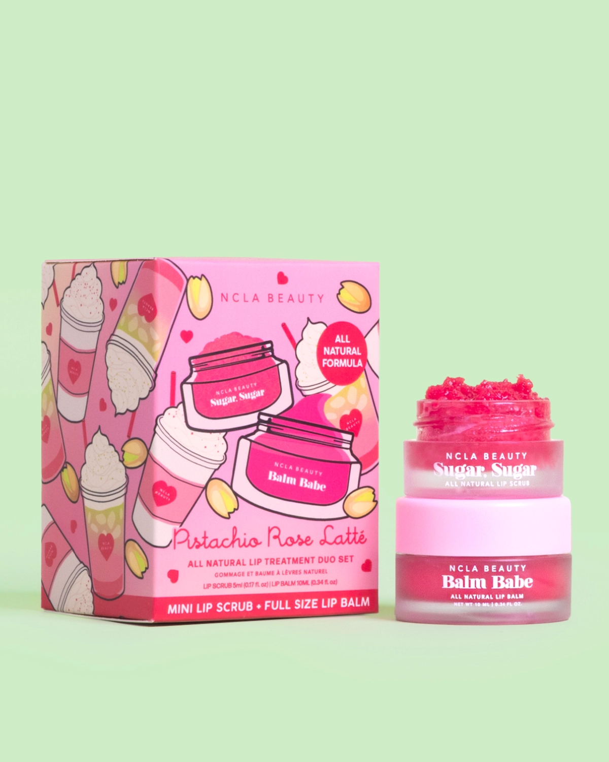 Get ready to pucker with this irresistible duo! Polish your lips smooth with the sugar scrub, then glide on the silky Pistachio Rose Latte balm for lasting softness. Sweet rose and nutty pistachio notes create a flavor experience that's totally kissable and oh-so-luxe.