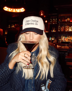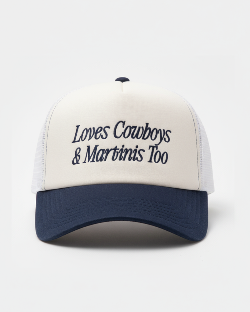 Show off your love for cowboys and martinis with this playful embroidered hat in navy and natural tones. Perfect for adding a cheeky touch to any casual outfit, it keeps you stylish and shaded on sunny days.