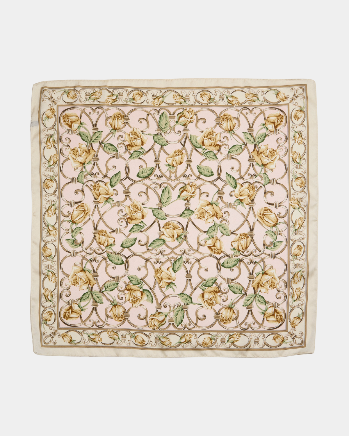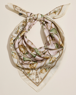 This baroque rose print scarf captures timeless sophistication in a lightweight silk-feel square. Golden roses and ornate scrollwork create a striking visual statement, while the sumptuous fabric drapes with effortless grace. Perfect for elevating both classic and contemporary looks.