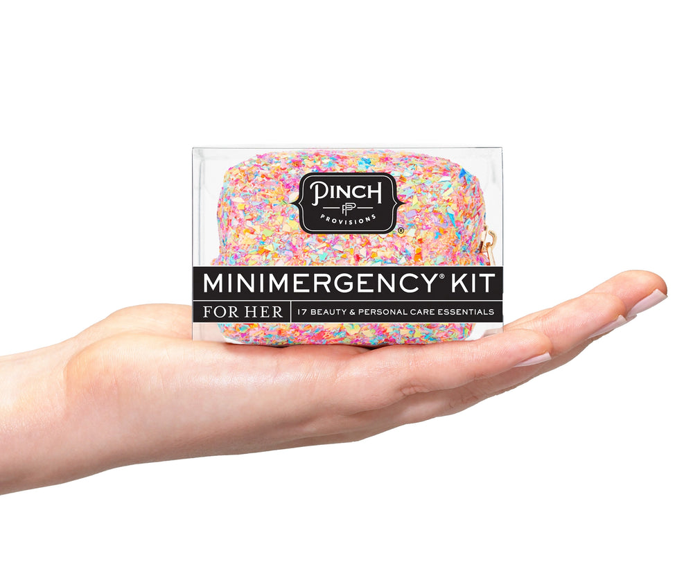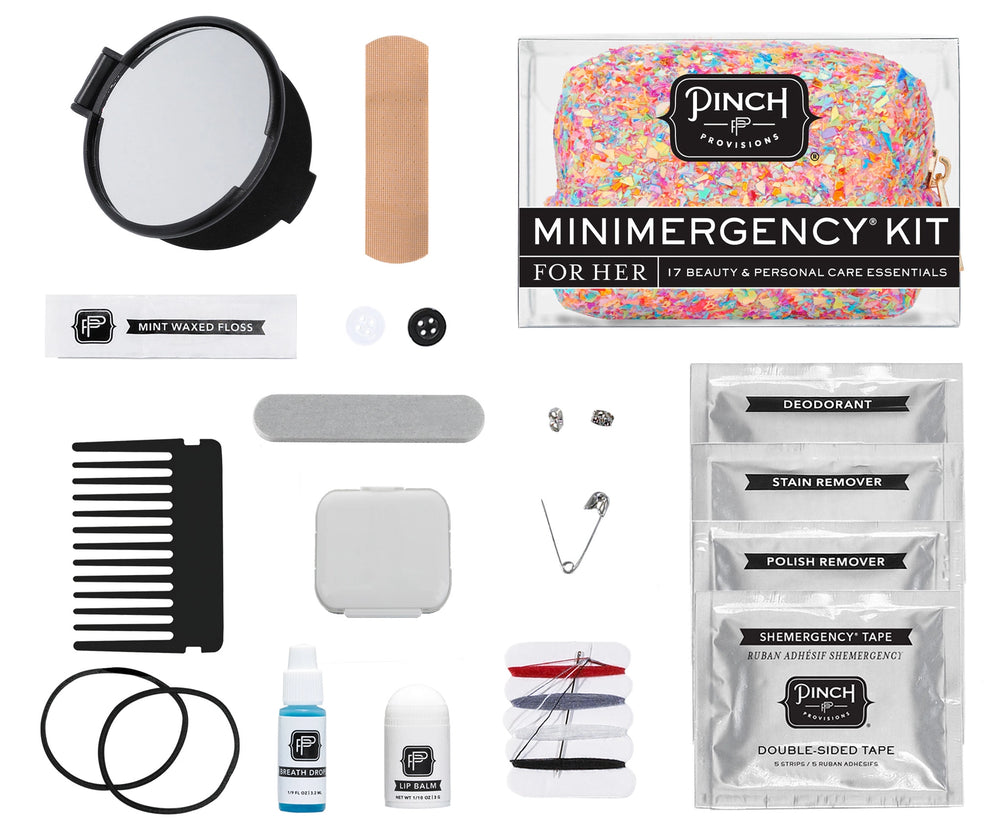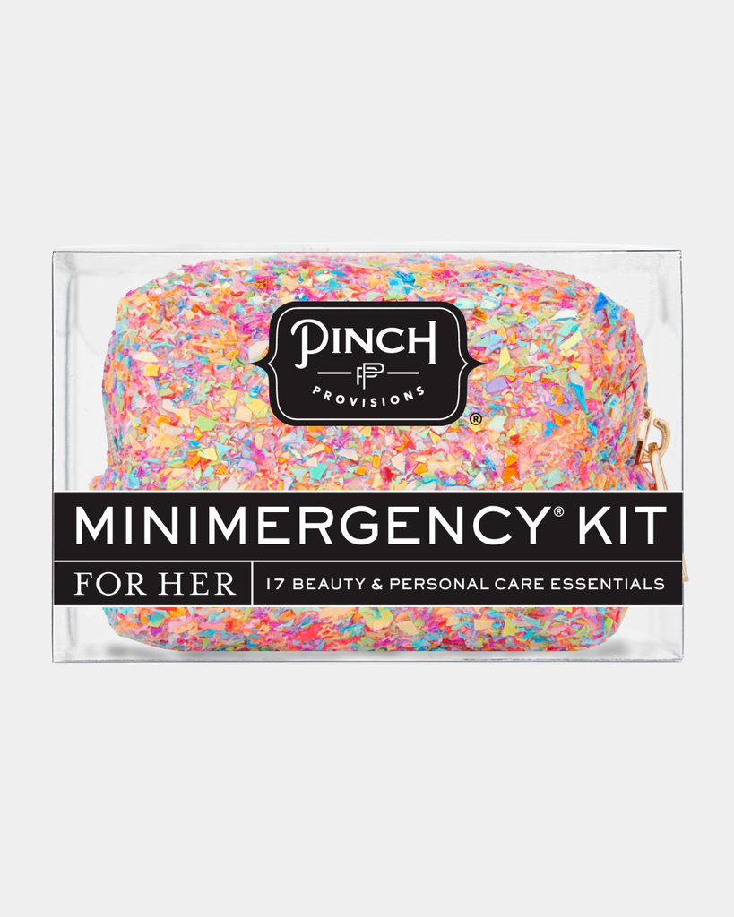 Sparkle through any style crisis with our Neon Multi Minimergency Kit! Packed with 17 glittery essentials—from stain remover and safety pins to lip balm and a compact mirror—you'll be ready for anything. Because sometimes you need a little shimmer and a lot of solutions, all in one playful pouch.