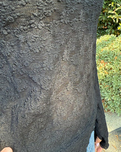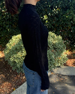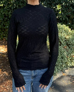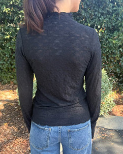 This soft mesh like top features an intricate tonal pattern, long sleeves and a slight mock neck line. Perfect for wearing solo or for layering.