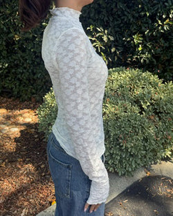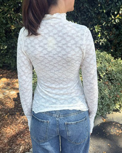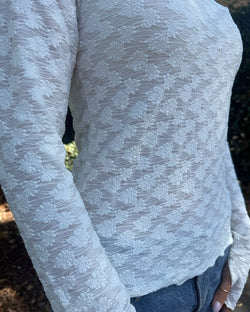 This soft mesh like top features an intricate tonal pattern, long sleeves and a slight mock neck line. Perfect for wearing solo or for layering.