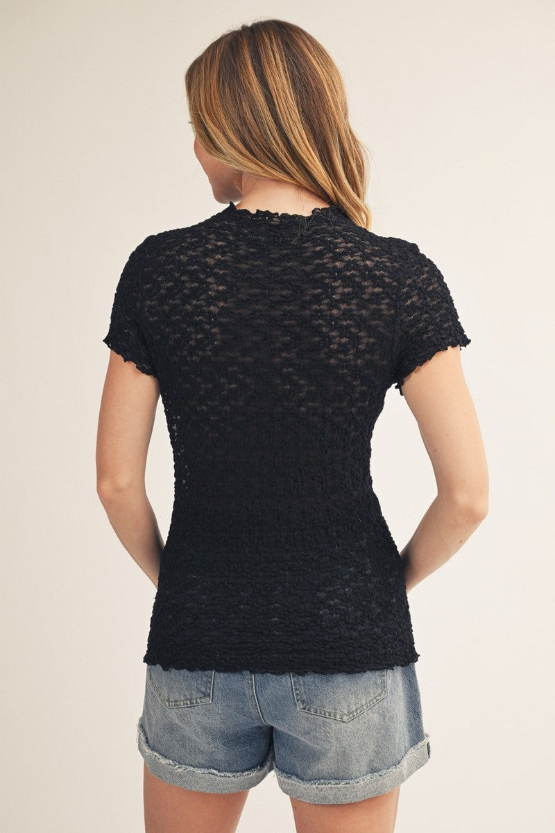Delicate floral lace meets timeless elegance in this fitted top. The mock neck and short sleeves create a polished silhouette, while hue pairs effortlessly with any wardrobe. Perfect for layering or wearing solo.