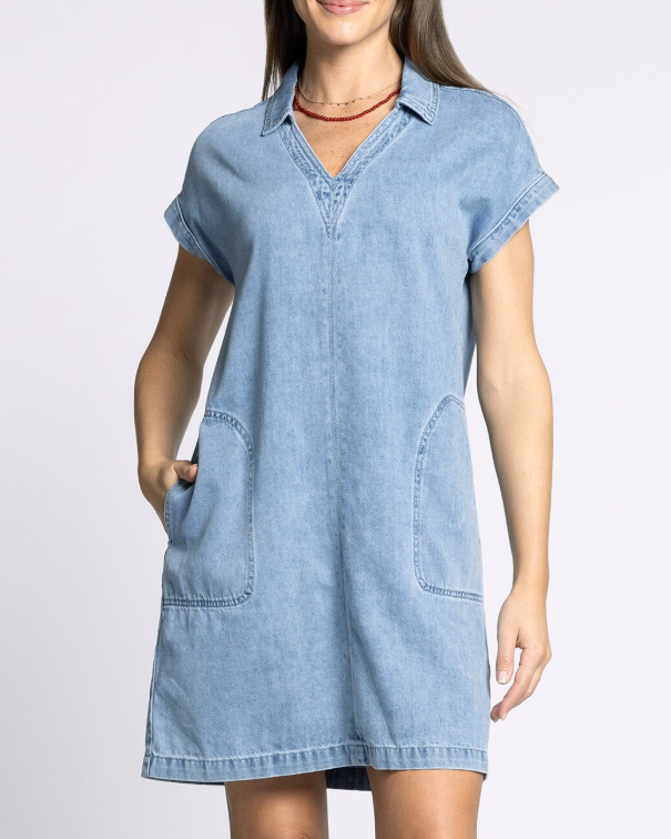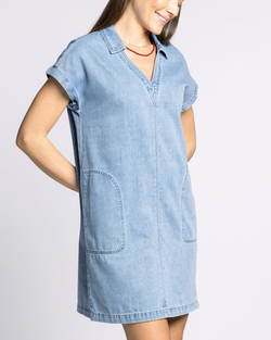 This classic denim mini dress features a collared v-neckline, short sleeves and side pockets. A staple dress to wear all season long. Style with everything from sandals to sneakers to boots.