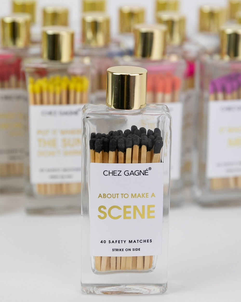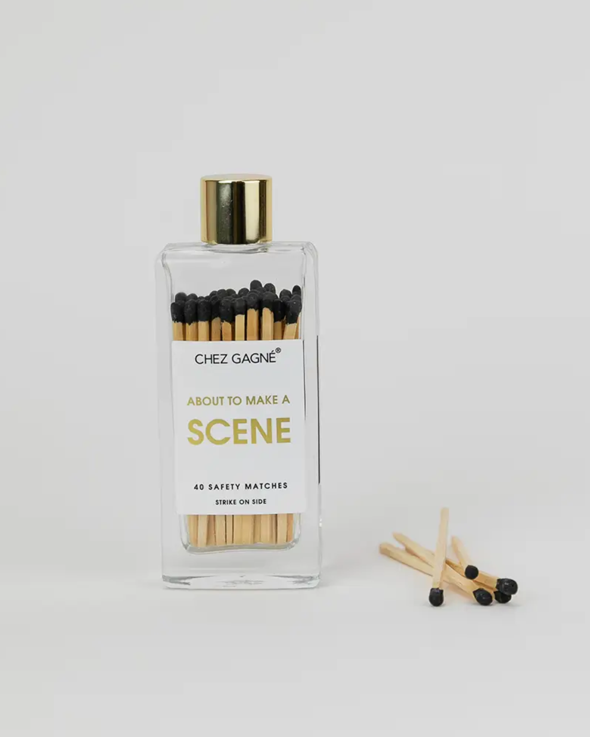 Sometimes your energy matches your matches. About To Make A Scene safety matches come in a clear glass bottle with a shiny gold lid and black-tipped sticks—perfect for lighting candles or adding a fun touch to any table.