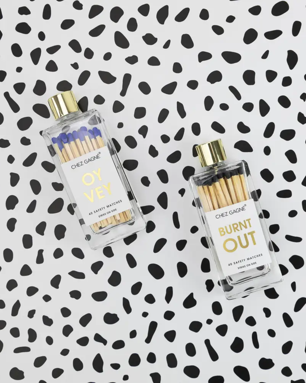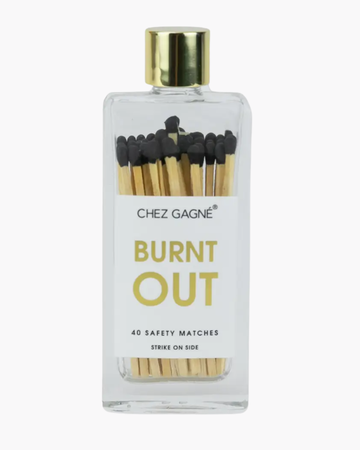Sometimes your energy matches your matches. Burnt Out safety matches come in a clear glass bottle with a shiny gold lid and black-tipped sticks—perfect for lighting candles or adding a fun touch to any table.