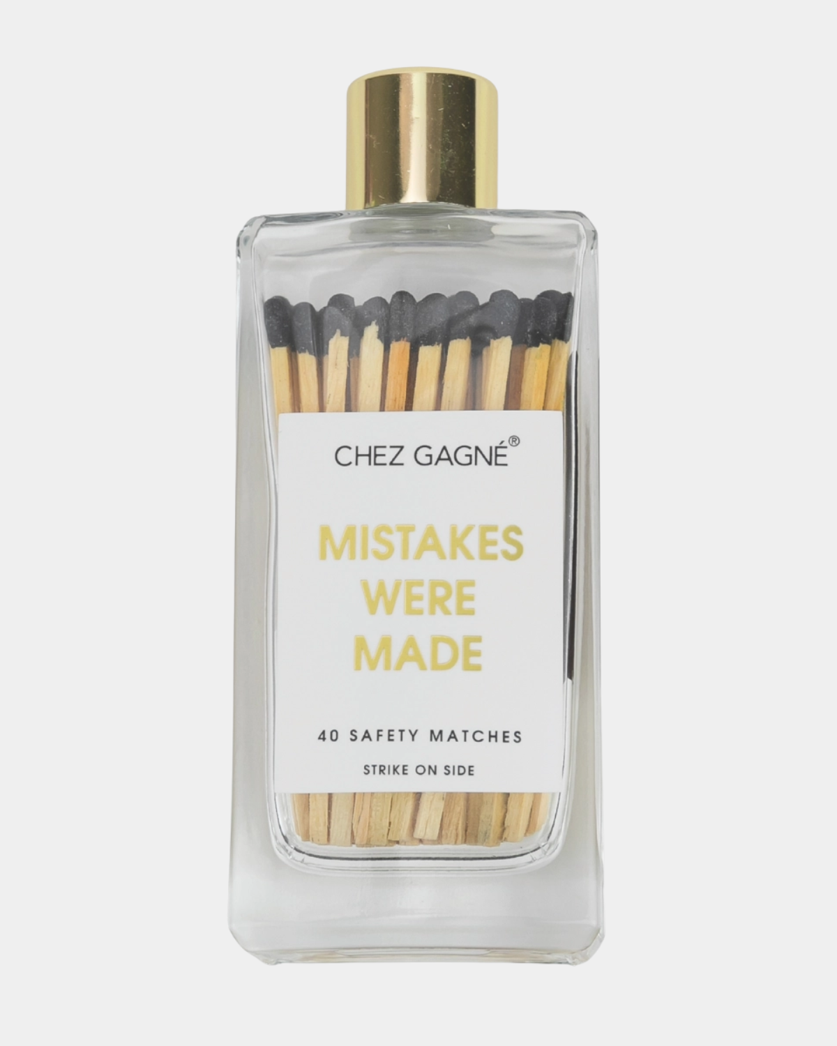 Strike a match and laugh it off. Our Mistakes Were Made safety matches turn every mishap into a moment of humor. Black-tipped matches nestled in a stylish glass bottle with a gold lid—because sometimes the best response to chaos is a good chuckle and a little flame.