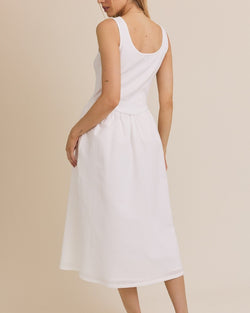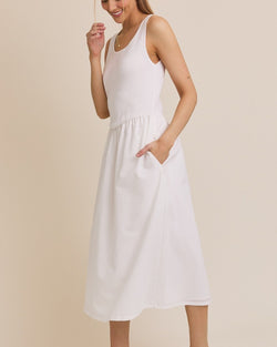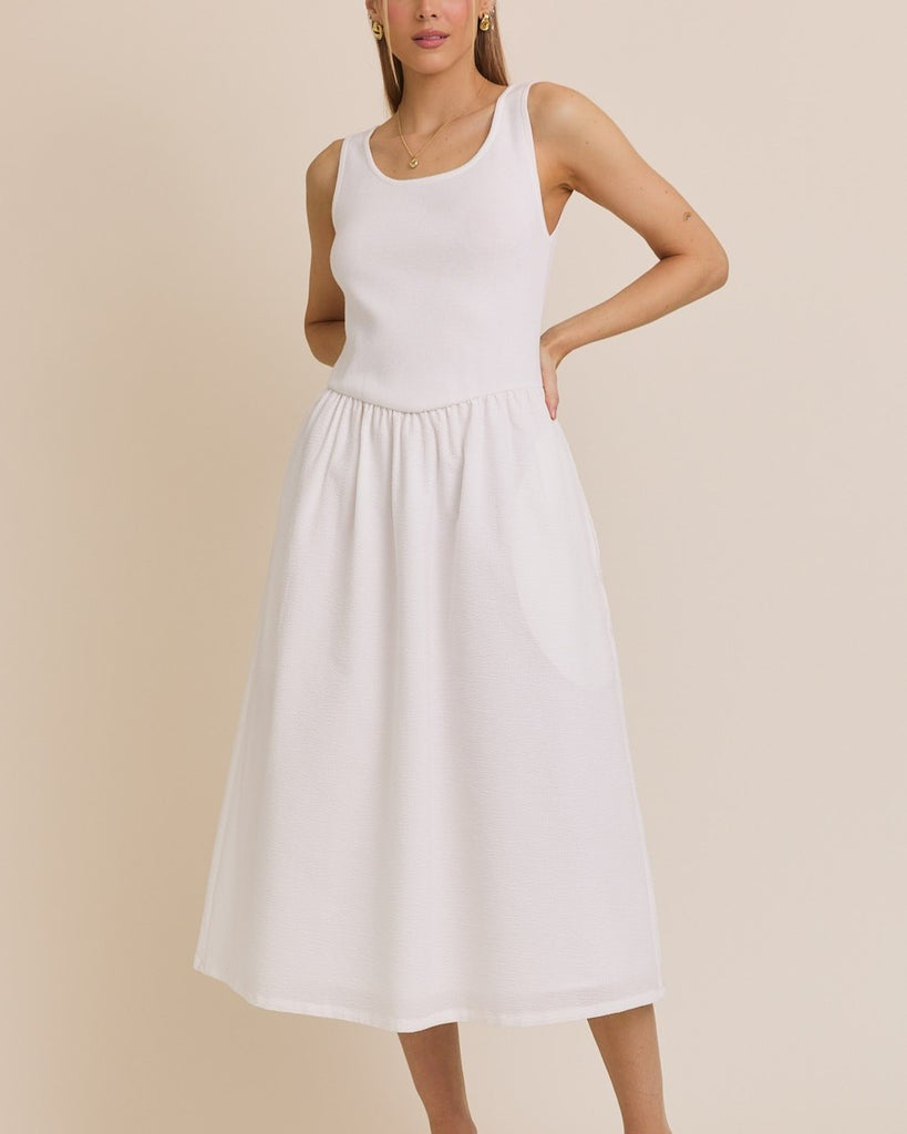 Unleash your playful side with our U-Neck Sleeveless V-Waist Fit & Flare Midi Dress in white! The flattering v-waist design and midi length will make you feel confident and stylish. Perfect for any occasion, this dress is a must-have addition to your wardrobe.