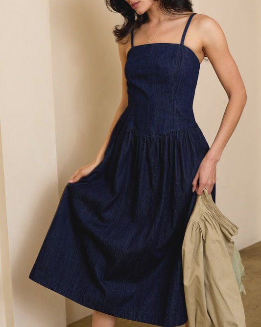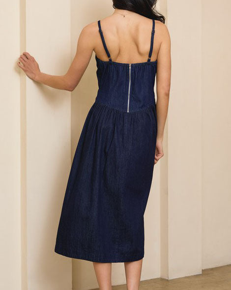 This chic denim dress features a sleeveless silhouette with a drop pointed waistline. On trend and so chic, this dress can be worn day or night.