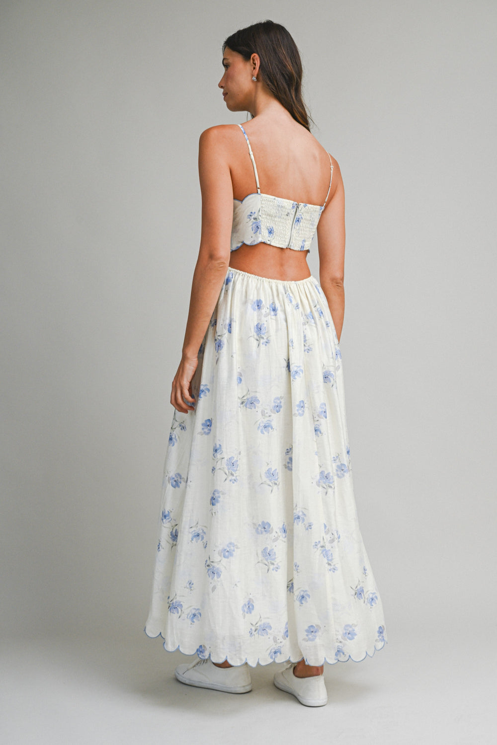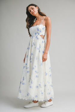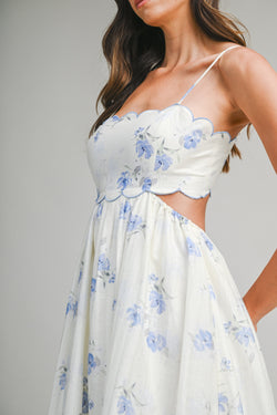 Playful blue floral midi dress with adjustable spaghetti straps, charming scalloped trim, and a cheeky back cutout. This fun piece combines feminine details with modern flair.