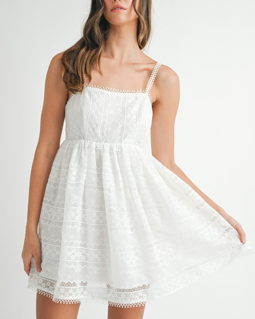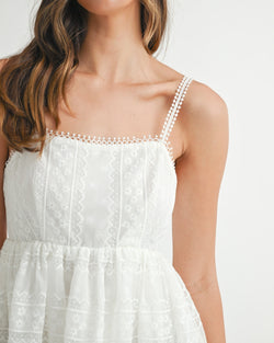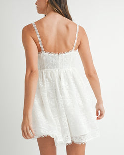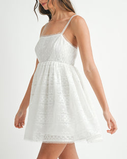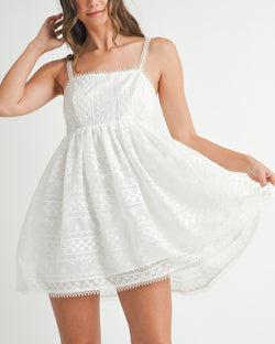This dress is a must-have for any fashionista! Featuring a charming eyelet lace design in a lovely off white color, it's the perfect combination of sweet and sassy. With its mini length and playful style, this dress will have you turning heads wherever you go. (Fashion-forward and flirty!)