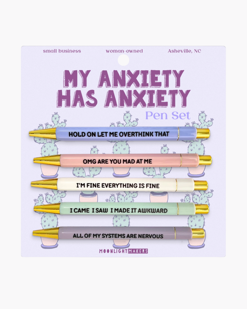 This cheeky 5-pen set speaks directly to anxiety lovers everywhere. Packed with hilarious one-liners like "OMG Are You Mad at Me?" and "I'm Fine Everything is Fine," these colorful pens transform everyday writing into comic relief. Perfect for gifting, mental health awareness, or keeping your own stress in check with a smile.