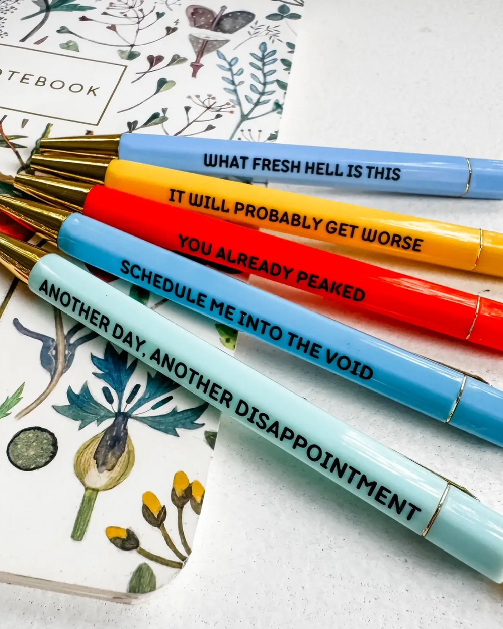 When life's a mess, you need the right tools to document the chaos. This witty pen set is perfect for anyone who appreciates dark humor and keeps their sense of style even when everything's burning down.