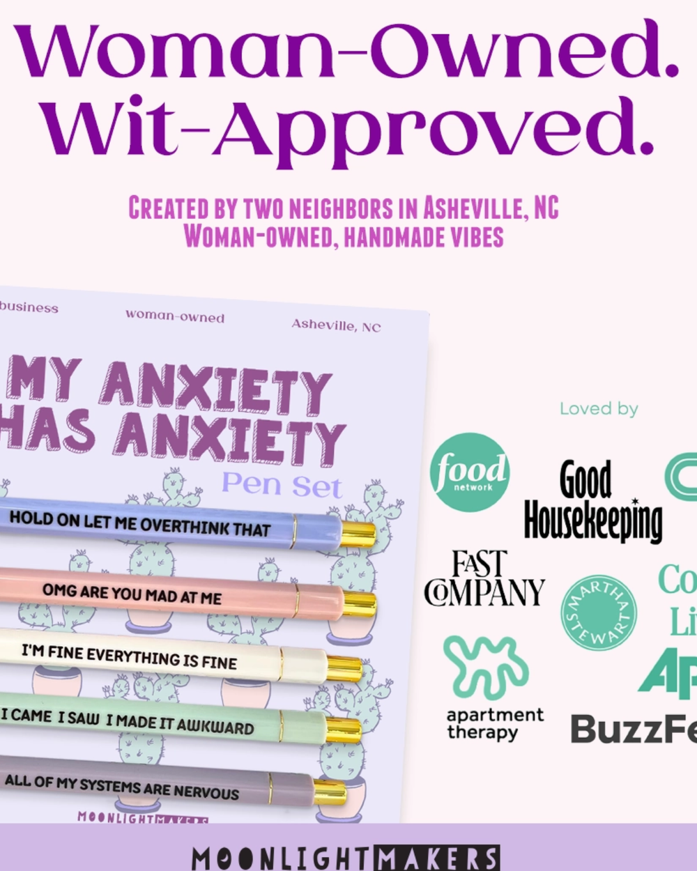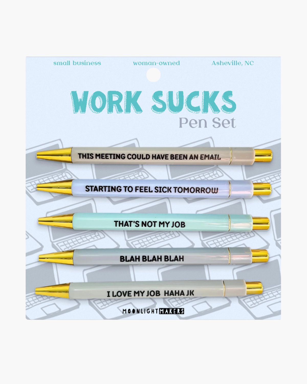 Five vibrant pens with gold accents and hilarious office quips—"The Meeting Could Have Been an Email" and "I Love My Job Haha JK." Perfect for adding laughs to your workday or gifting to coworkers who need a smile.