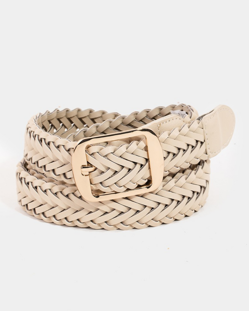 This braided belt features a distinctive faux leather texture. Enhance your wardrobe with an accessory that seamlessly elevates your refined sense of style.