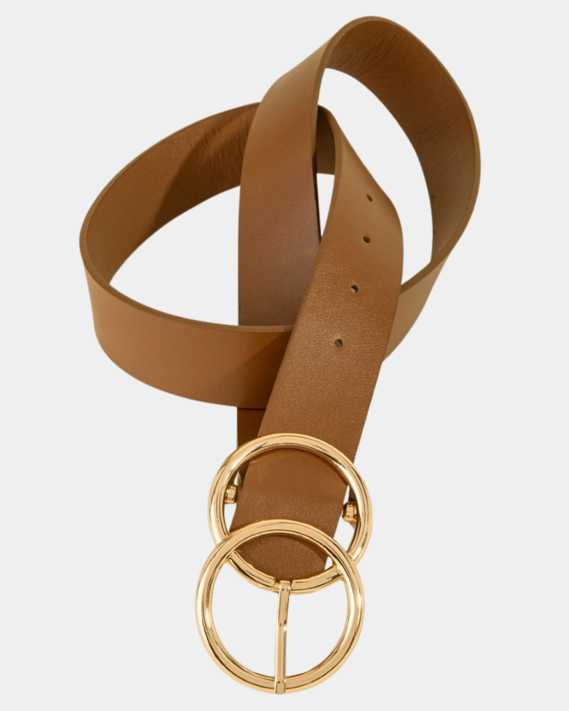 This vegan leather belt combines contemporary style with timeless appeal. The distinctive double hoop buckle in gold complements the rich camel tone, creating an accessory that effortlessly enhances any look.