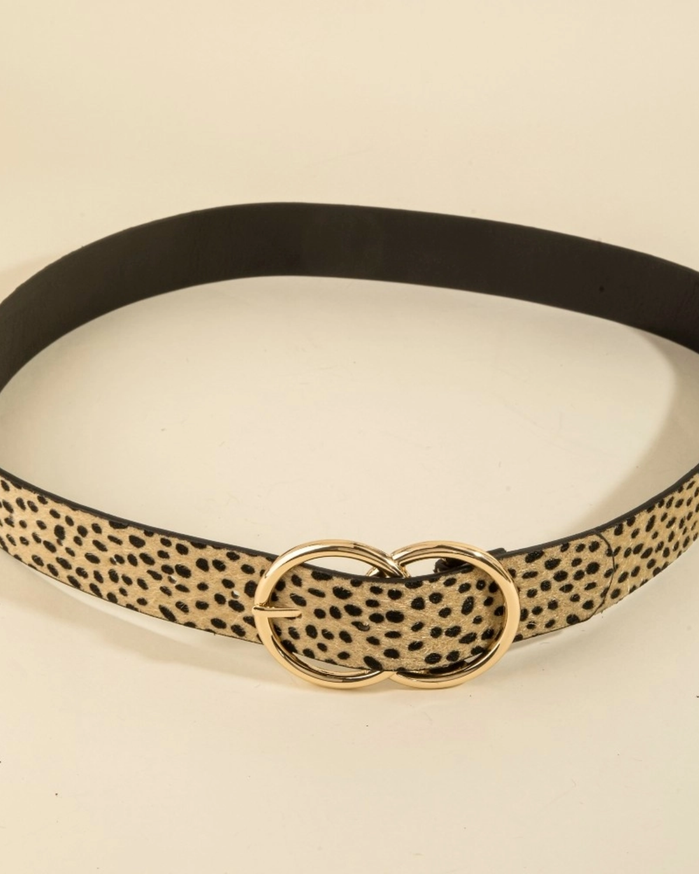 This vegan leather belt combines contemporary style with timeless appeal. The distinctive double hoop buckle in gold complements the rich tone, creating an accessory that effortlessly enhances any look.