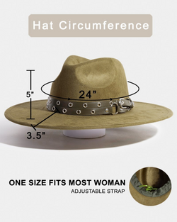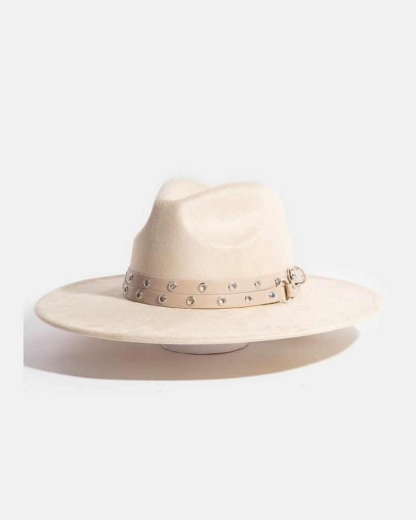 This fedora showcases a refined double grommet strap crafted from luxurious faux suede, blending contemporary design with classic elegance. It offers timeless sophistication that enhances any wardrobe with ease.