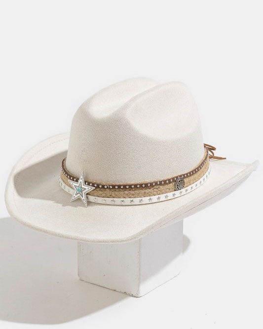This cowboy hat features a unique western star layered strap detail. A must for casual days, concerts and beyond!