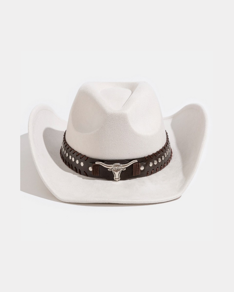 This ivory cowboy hat turns heads with its bold studded bullstrap, perfect for riding into fun with confidence.