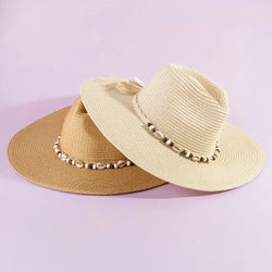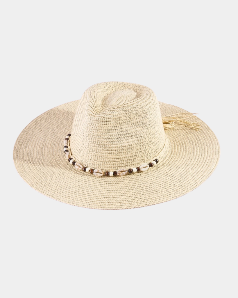 Saddle up in style with this eye-catching beaded shell cowboy hat. Crafted with intricate cowrie shell detailing on ivory straw, it's the perfect blend of Western charm and coastal vibes.