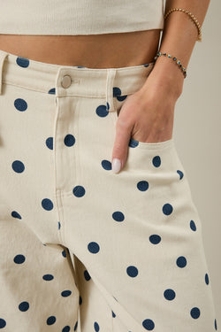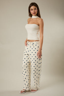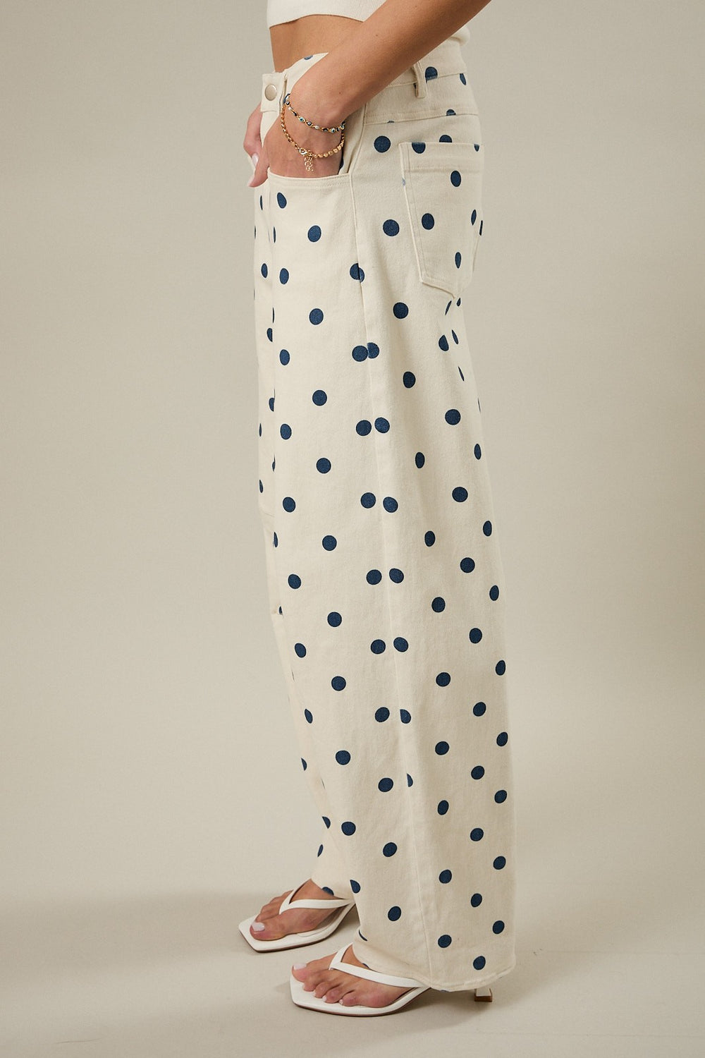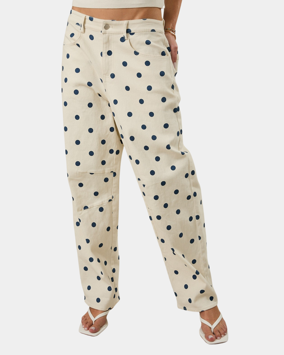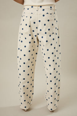 Playful polka dots meet modern silhouette in these cream and blue barrel pants. The relaxed fit and tapered ankles create an effortlessly chic look that works for casual outings or dressed-up occasions.