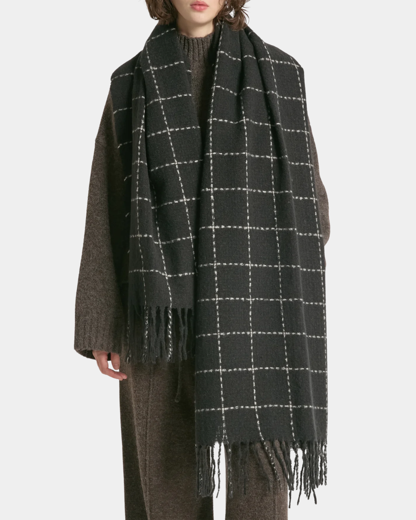 Elevate your look with this oversized windowpane blanket scarf, offering both warmth and understated elegance. Its generous size and refined pattern make it a versatile accessory for any wardrobe.