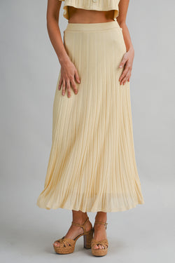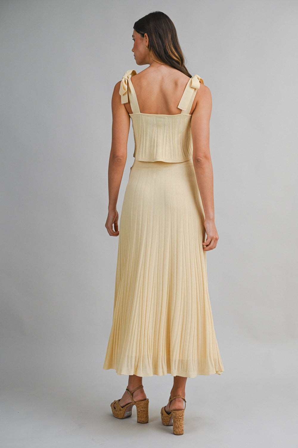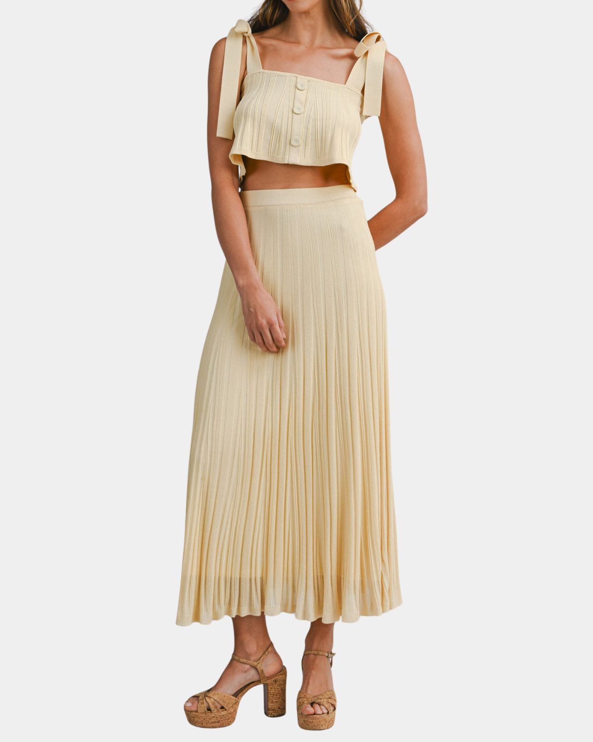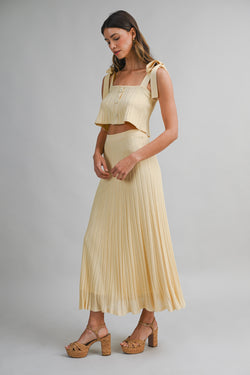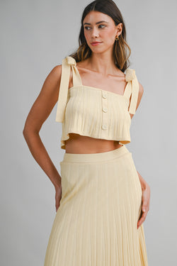 Delightful yellow ribbed two-piece set pairing a cropped sleeveless top with adjustable self-tie shoulder straps and a coordinating midi skirt boasting a soft pleated fabric. Mix-and-match magic for carefree, stylish days.