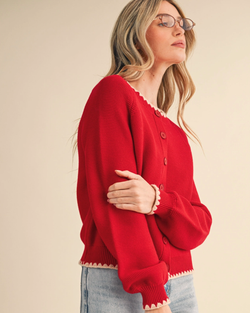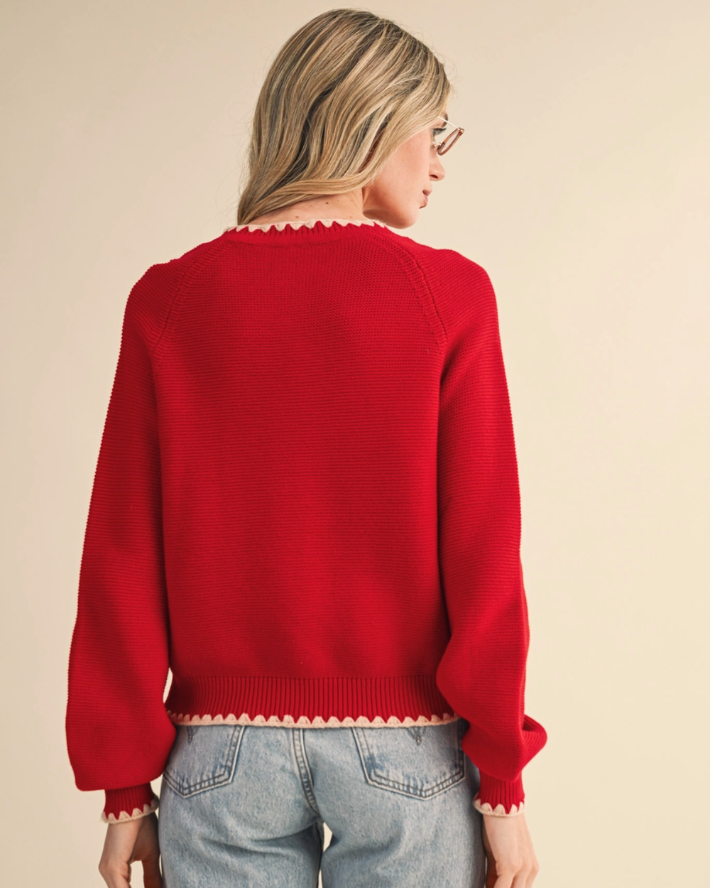 Wrap yourself in cozy charm with this playful cardigan, where striking contrast stitching meets a relaxed fit. Comfortable, stylish, and ready to become your new favorite go-to.