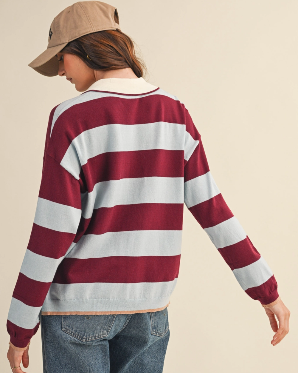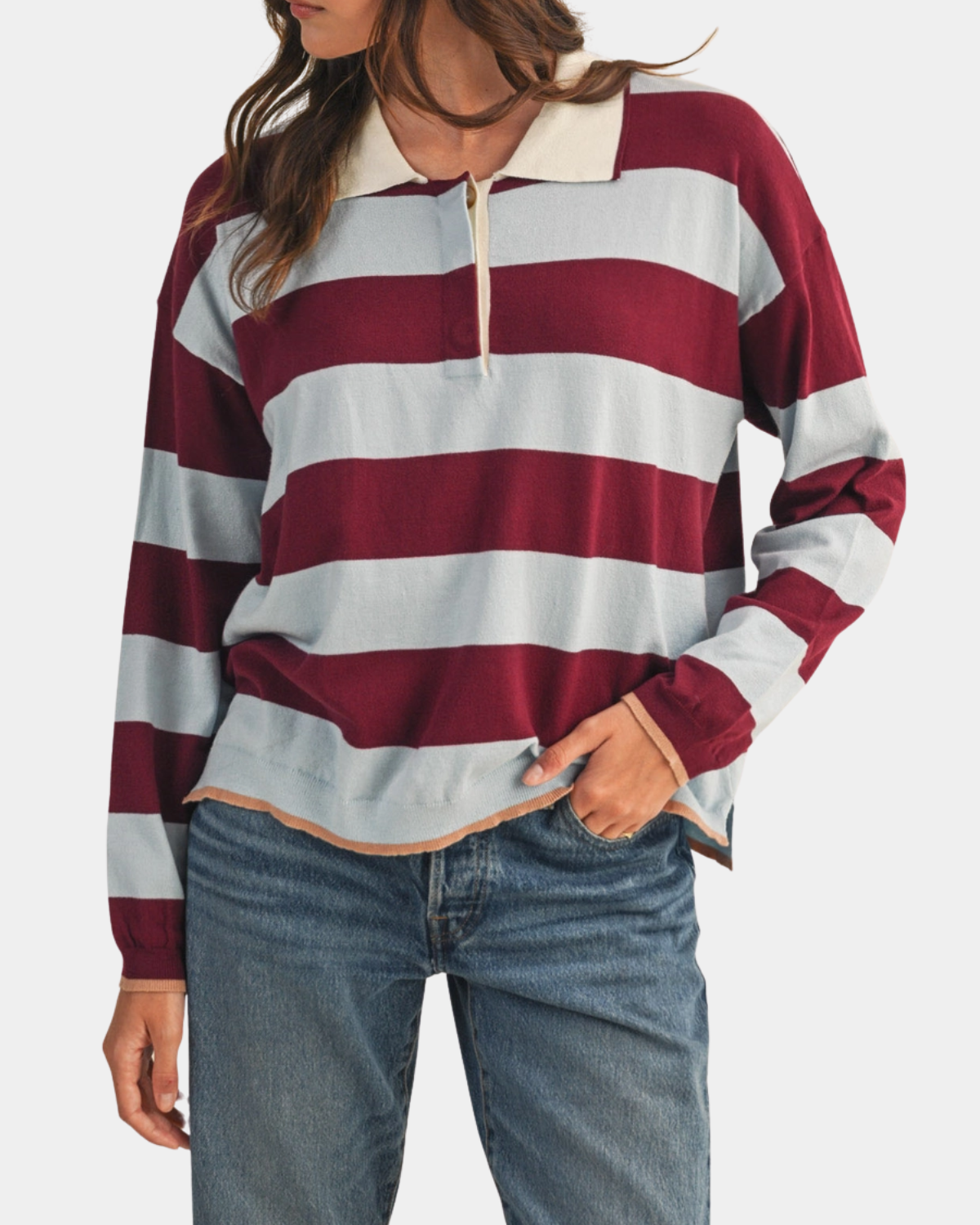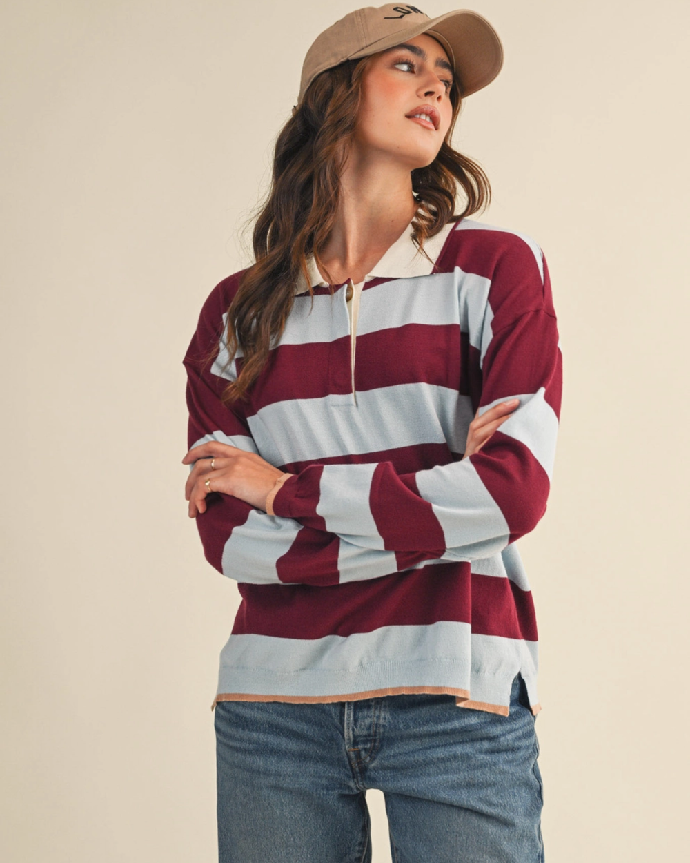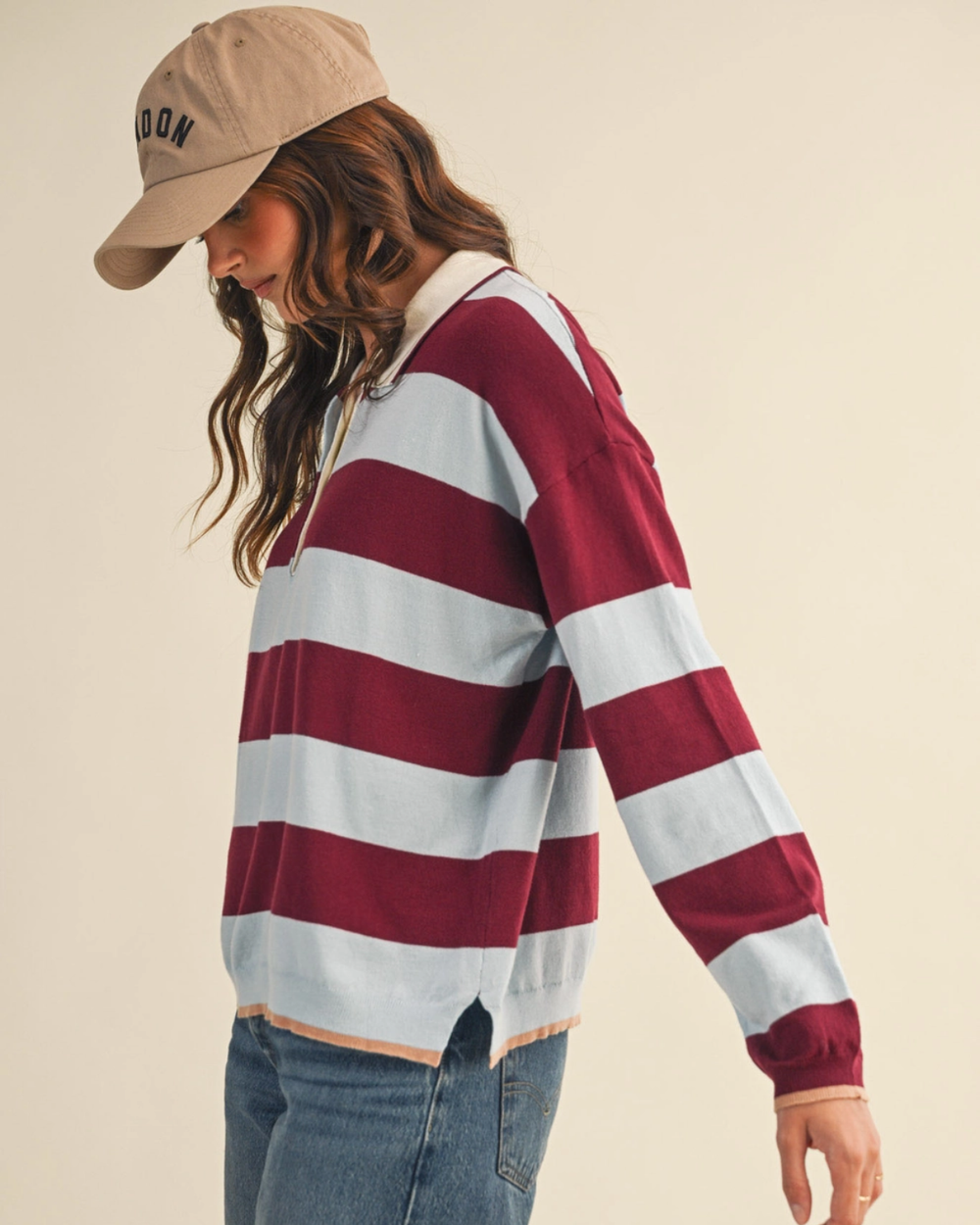 Score major style points with this bold burgundy and blue striped rugby sweater. Whether you're channeling vintage athletic charm or just want effortless weekend vibes.