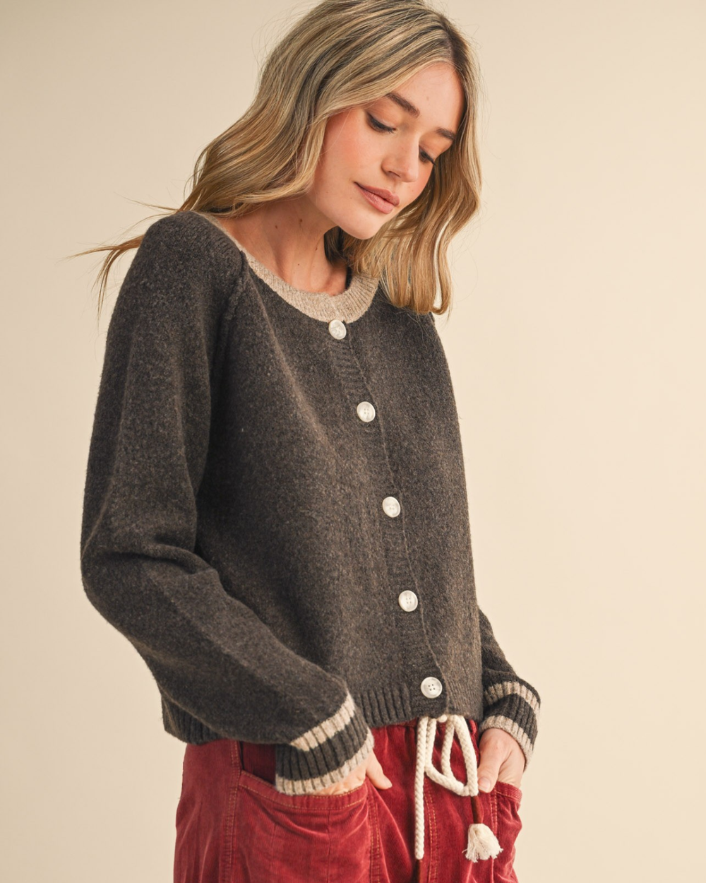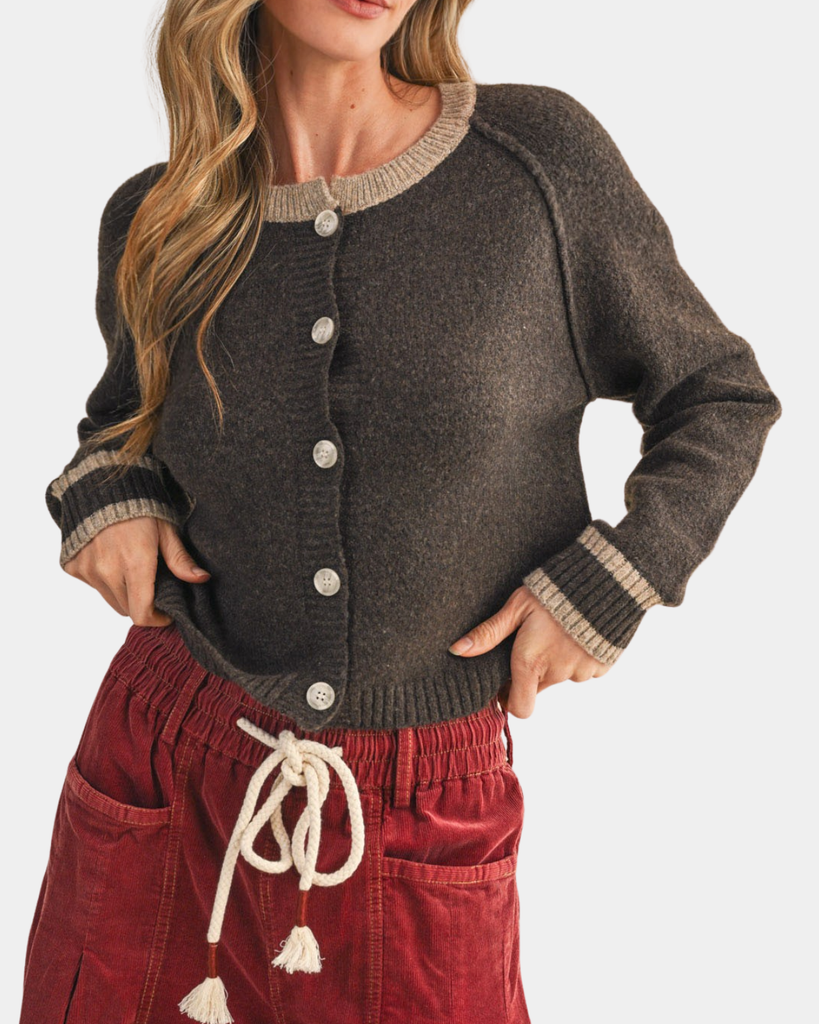 Wrap yourself in cozy charm with this two-tone cardigan in rich chocolate brown. Perfect for layering over your favorite outfits, it adds instant warmth and style to any look.