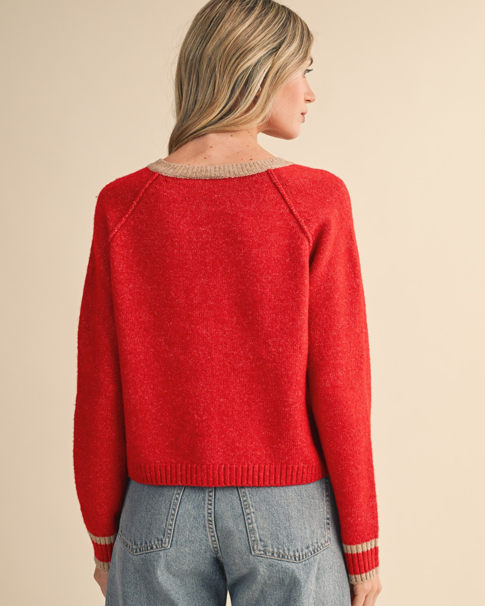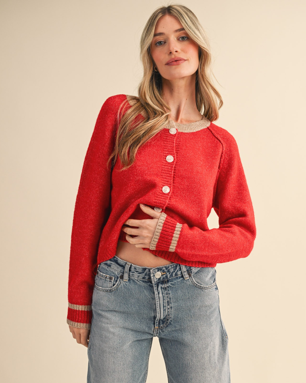 Effortlessly chic in red and beige! This two-tone cardigan layers like a dream, mixing warm neutrals with a pop of color.