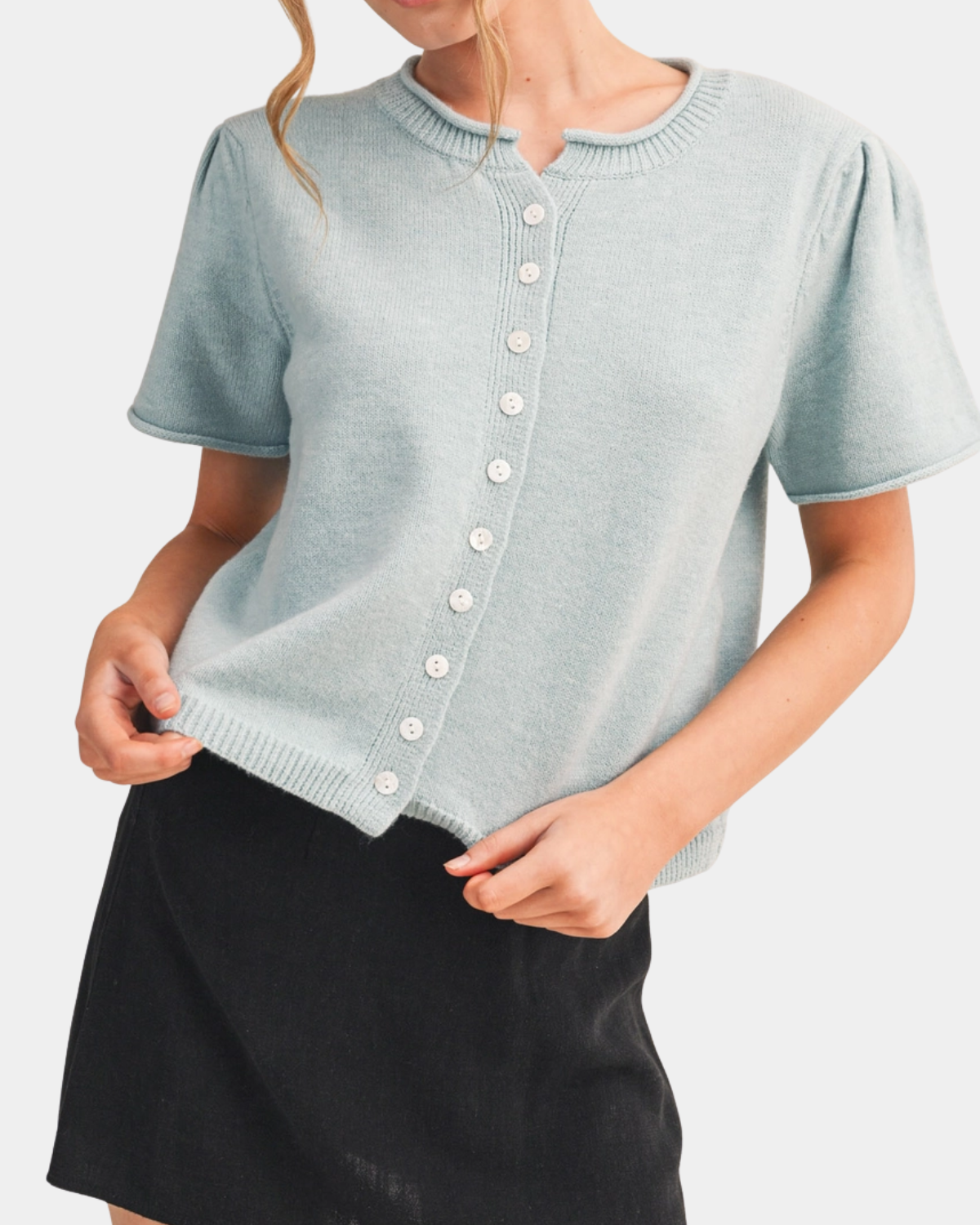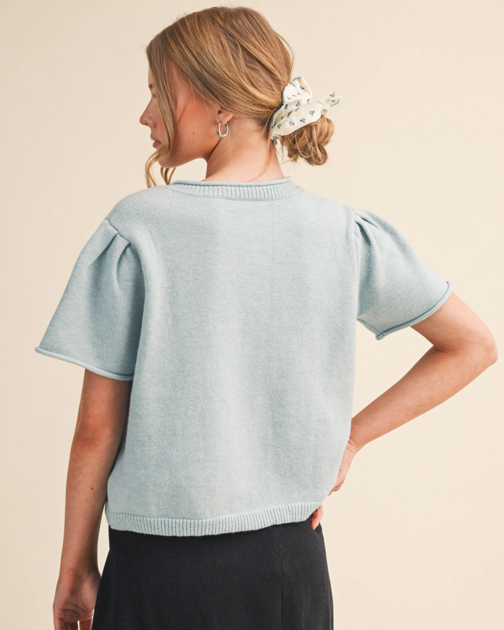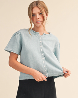 Adorable sky blue cardigan with gathered puff shoulders and rolled cuffs. The perfect breezy layer for adding charm to any outfit!