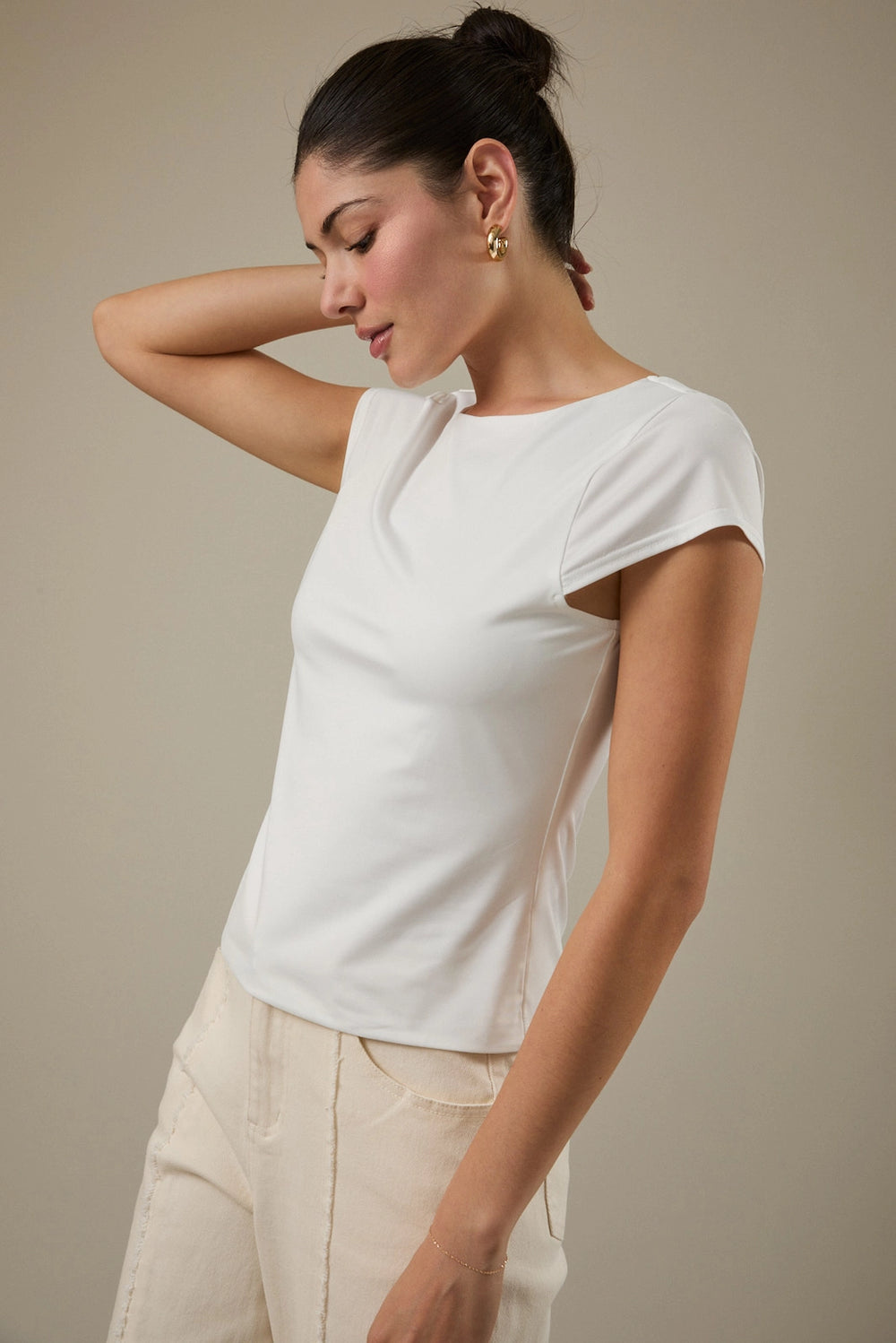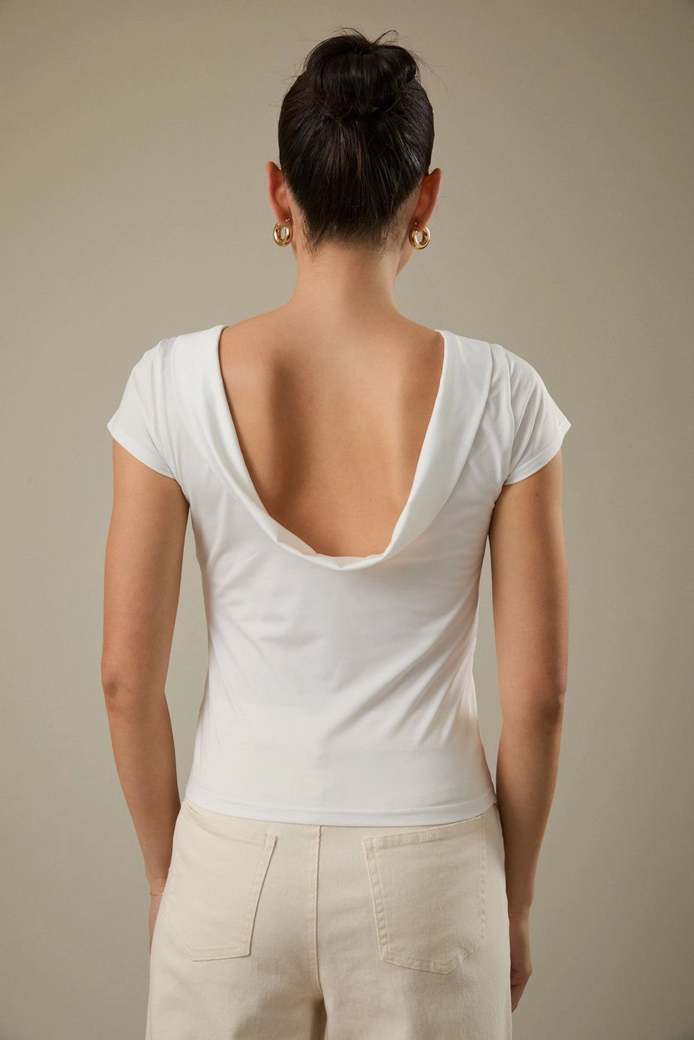 This draped cowl back top creates a fluid, flattering silhouette that transitions seamlessly from day to evening. Crafted in crisp white, it's a versatile essential that pairs with everything in your wardrobe.