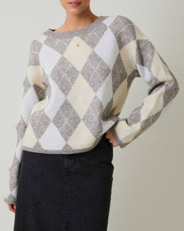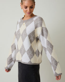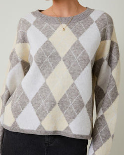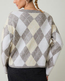 This soft and cozy sweater features a chic argyle print and a round neckline. An easy pullover style that is a must for casual days.
