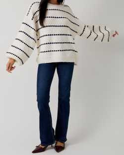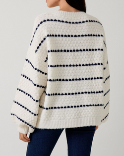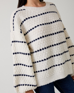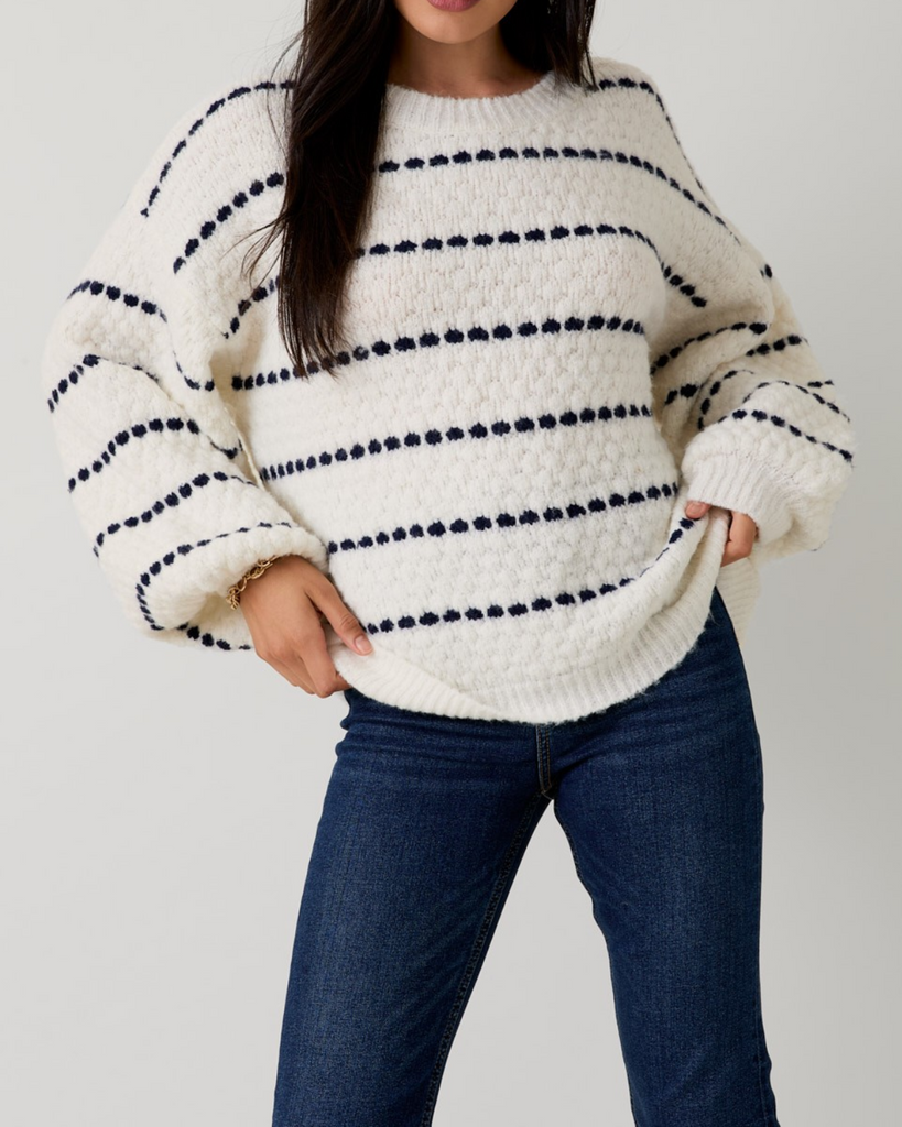 Cozy up in style with this Striped Balloon Sleeve Sweater in crisp white and navy, perfect for adding a fun twist to your everyday look. Its playful puffed sleeves bring a charming flair while keeping you snug and comfy all day long.