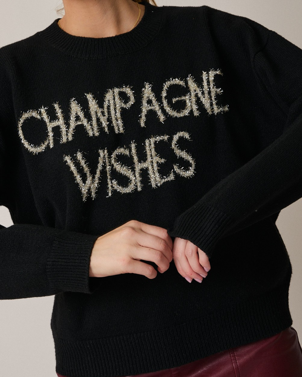 Celebrate every cozy moment with the Champagne Wishes Sweater in black, perfect for toasting to comfort and style. Its soft fabric keeps you warm while adding a bubbly touch to your look.