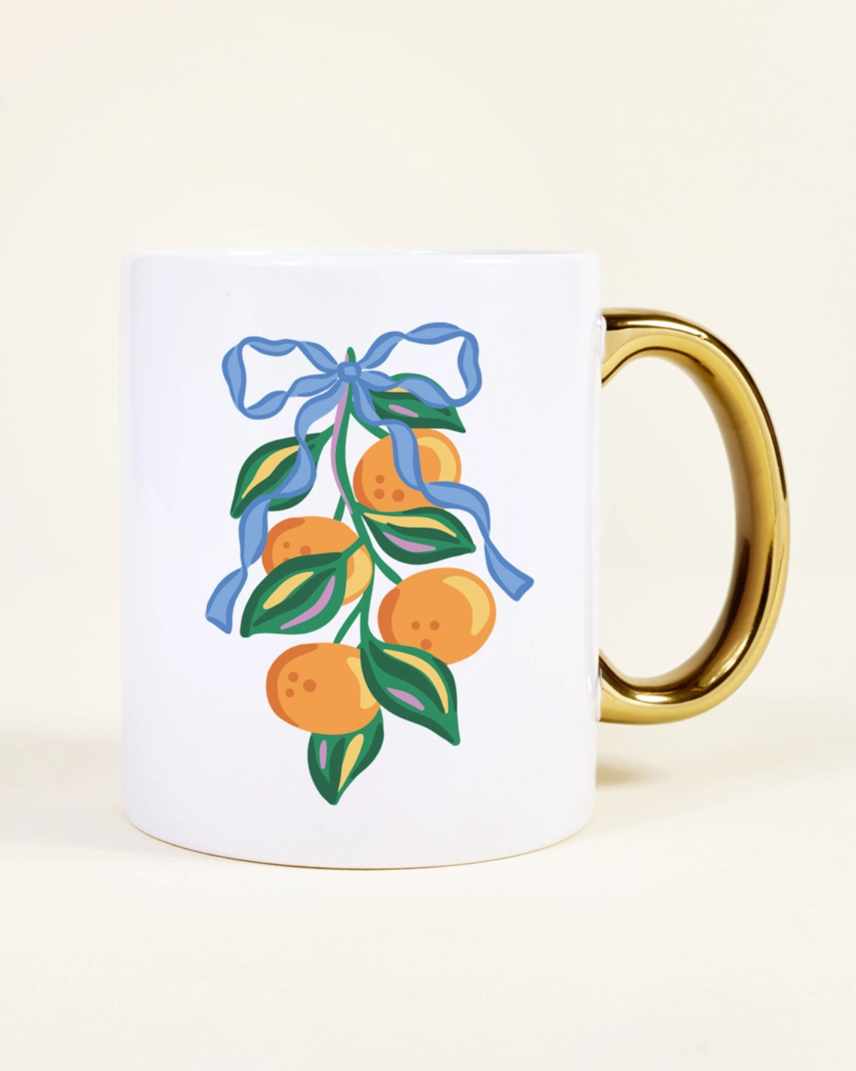 This charming ceramic mug features a gleaming golden handle and whimsical design that pairs perfectly with our Capri Italia collection. Ideal for your morning brew or evening wind-down, it's as delightful to display as it is to use.