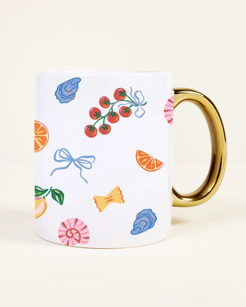 This charming ceramic mug features a gleaming golden handle and whimsical design that pairs perfectly with any Italian Summer collection. Ideal for your morning brew or evening wind-down, it's as delightful to display as it is to use.