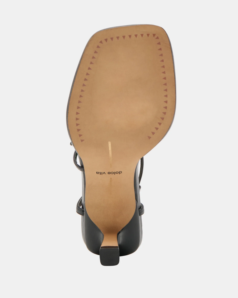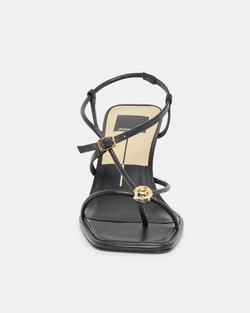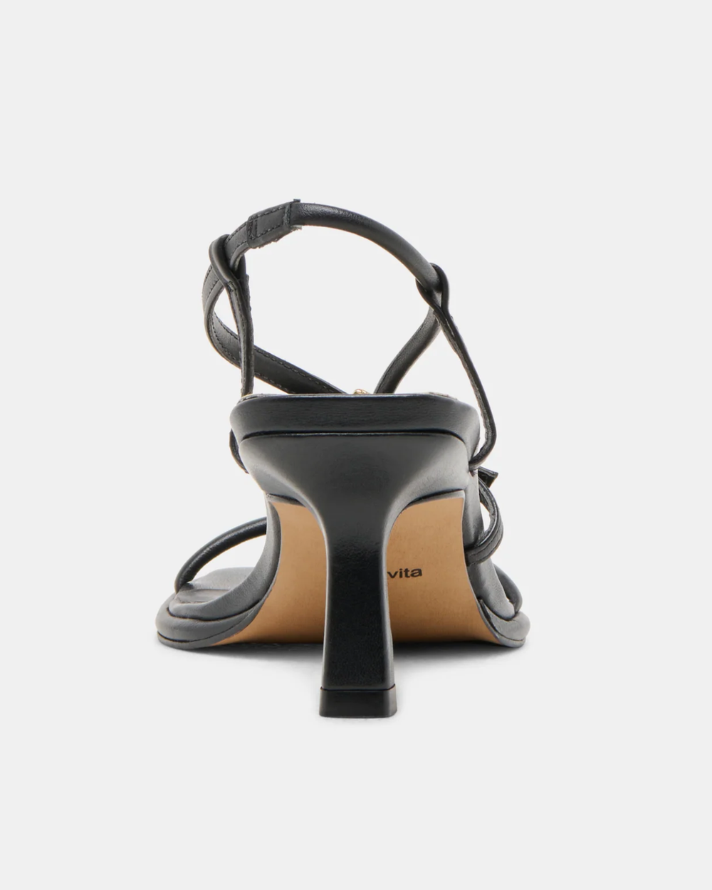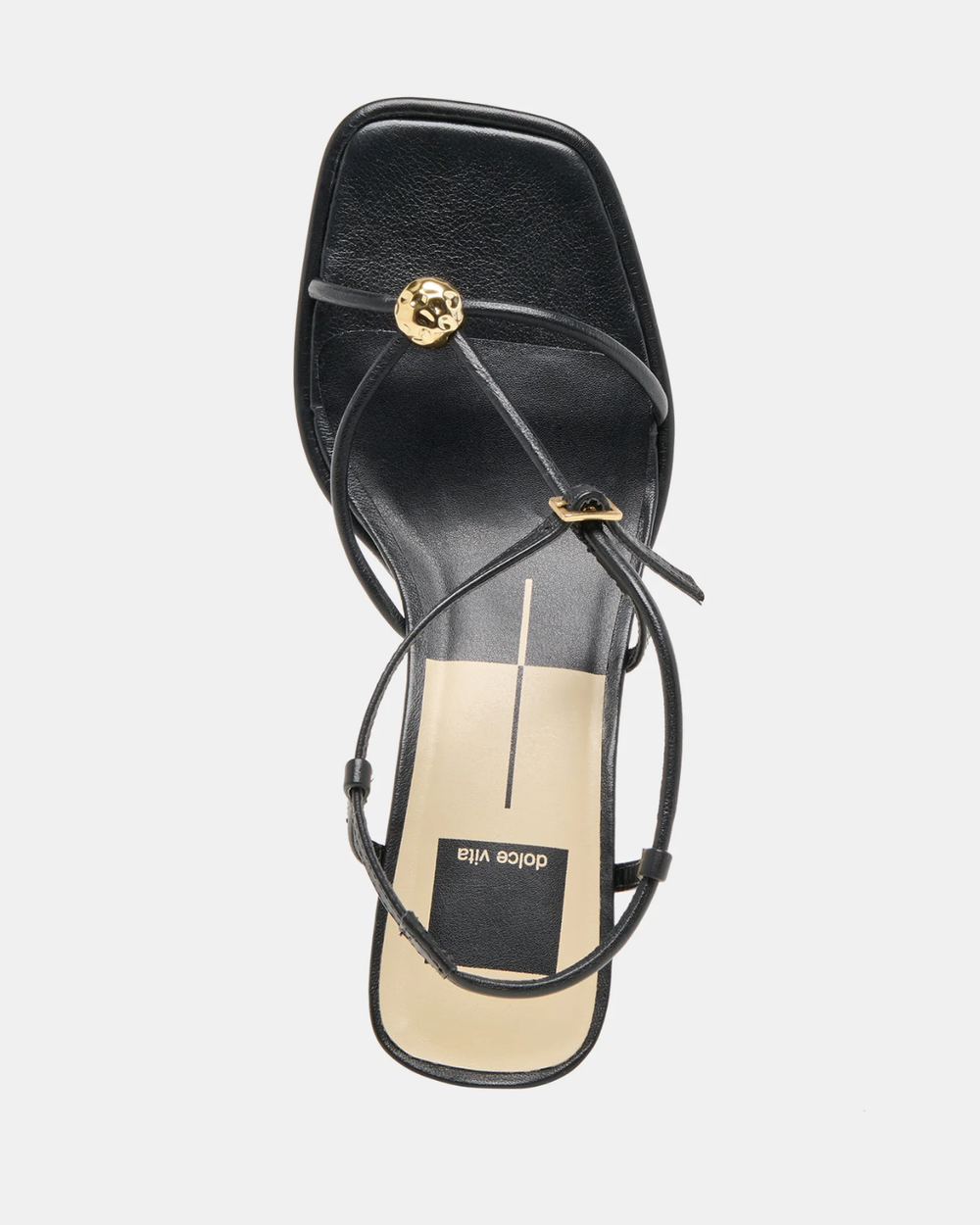The Mylee heel delivers refined style with its architectural silhouette, squared toe, and adjustable strap accented with gold hardware. Crafted sustainably, this versatile design transitions effortlessly from cocktail events to celebrations.